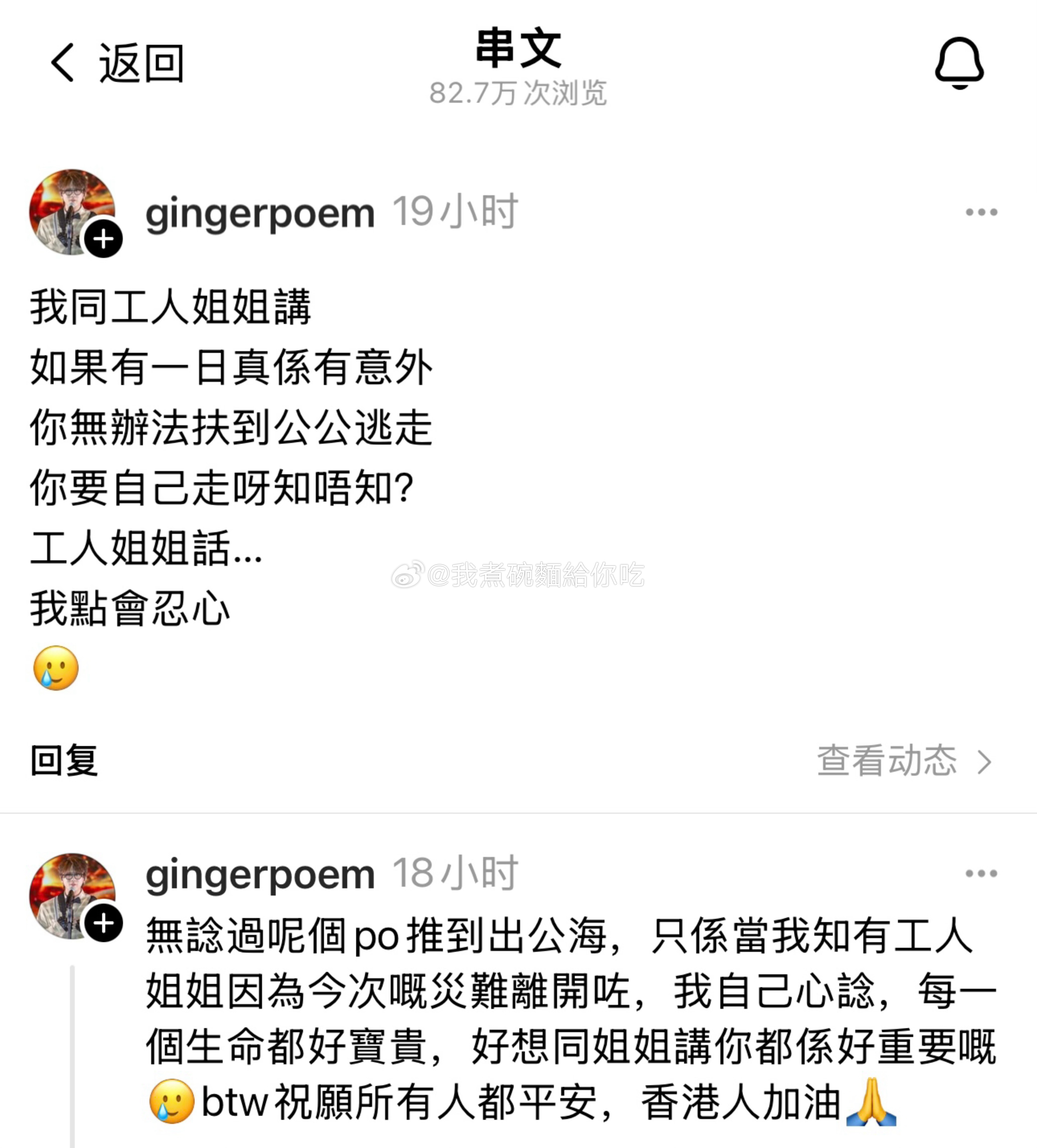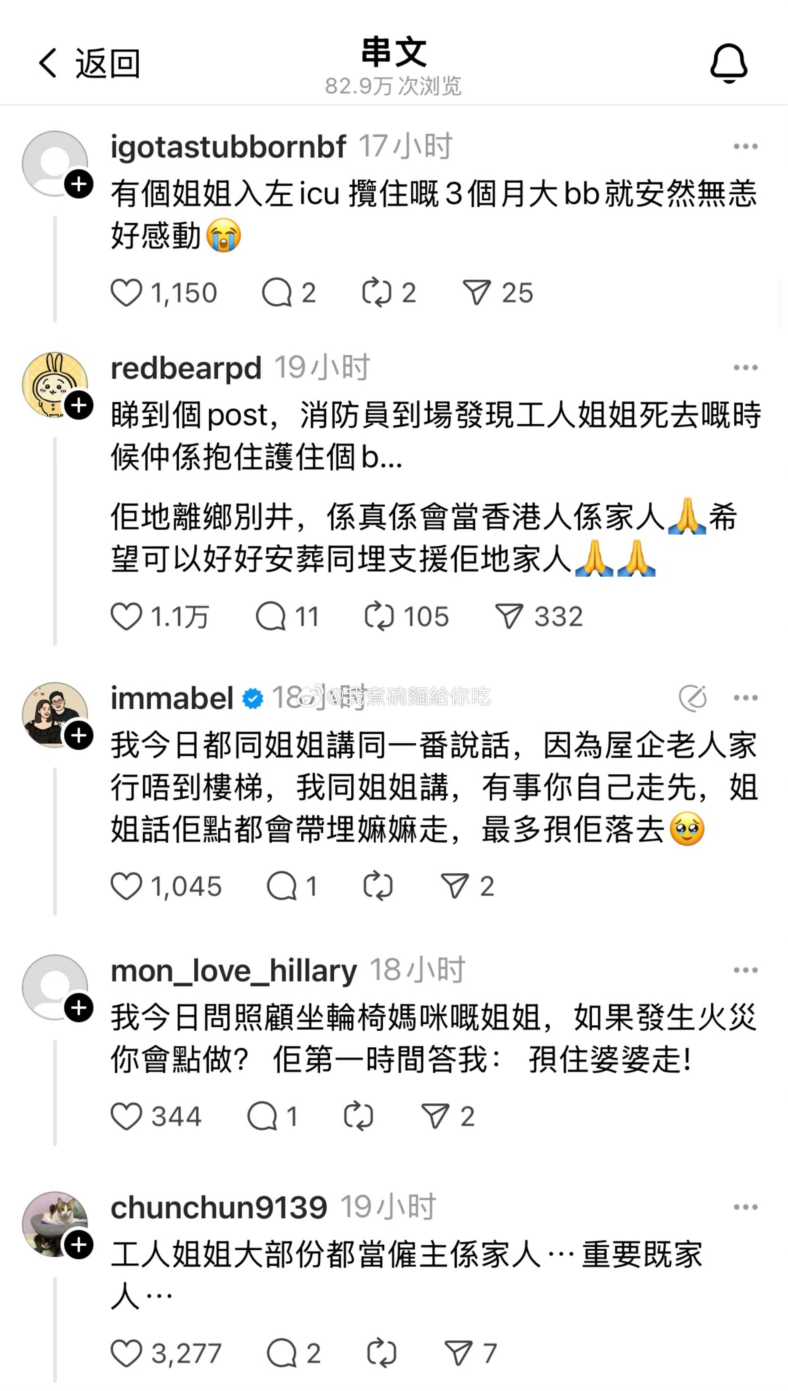 香港网友:“我跟工人姐姐讲,如果有一天真是有意外你无法扶到公公逃走,你要自己走呀知不知道?”工人姐姐说:“我怎会忍心”.该网友表示:「当我知道有工人姐姐因为今次的灾难离开了,我自己心想,每一个生命都好宝贵,好想跟工人姐姐讲你都是好重要的。祝愿所有人都平安,香港人加油。」🙏