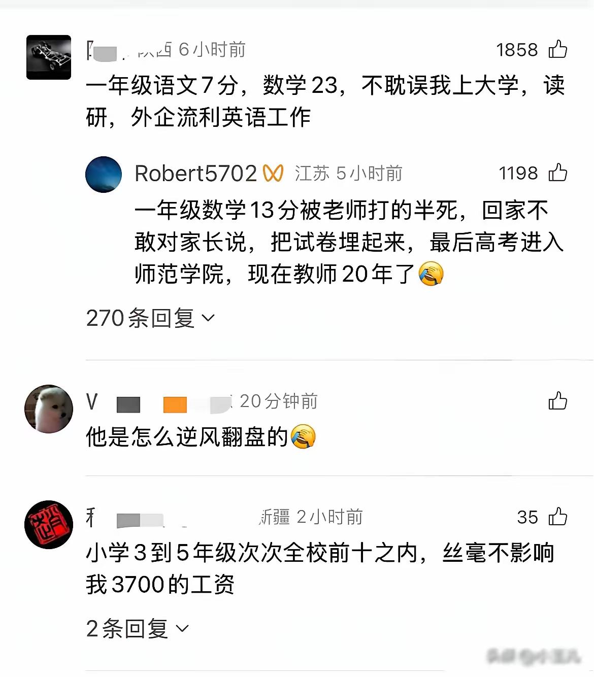 家长不要焦虑了!广东,女孩在收拾房子时,居然意外发现哥哥1999年的小学数学试卷,他只考了57.5分,谁能想到,多年之后哥哥考上了211高校,网友:“我对孩子又有信心了,真是学渣的逆袭!” 网友评论: 小学低年级时大脑还没发育好,有些逻辑理解不了。只要长大一些就能性能满足。这就是为什么11,12月出生的孩子占很大优势,因为9月以后出生的孩子算下一年入学。对于小孩来说,几个月的差距大脑发育性能差距相当大的。 小学三年级数学考了 58 分,被叫家长。高考第一志愿报了北京名校差 2 分没录取,第三志愿走了 211,硕士考了 985。后遗症是拼音没学好,至今拿英语音标读拼音。 我1995到1998初中,分流班学生,肄业,没有毕业证,只有一本完成证书,证明完成九年义务教育。2011年我某211全日制硕士毕业,专业是现在爆火的电气工程类。 我们小时候考试难一些,成绩最好的有时候也只有70,80分,高年级,我小考考到重点中学去了,两门只有140分。