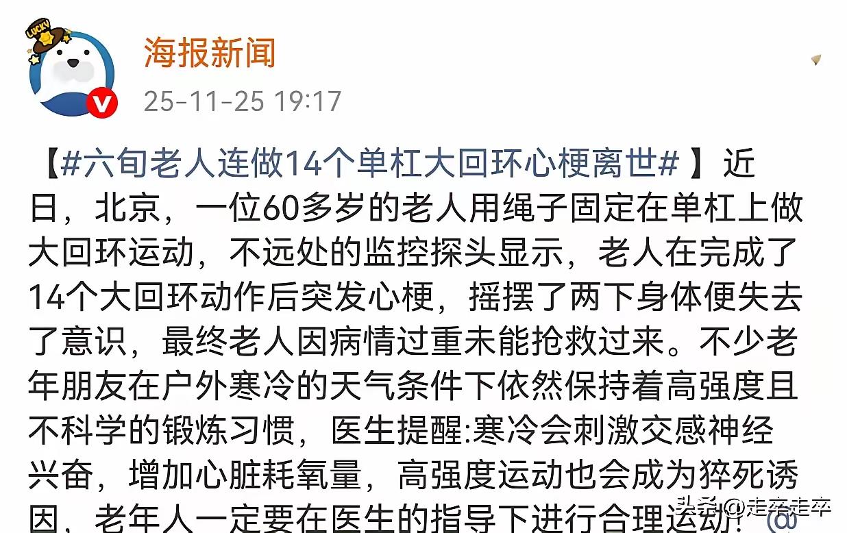 近期在北京发生了一件本来可以避免的悲剧。 一位六旬老人在北京丰台花园单杠上用绳子固定身体进行大回环,完成14次动作后突然失去意识,后经医生现场抢救,虽紧急心肺复苏,仍因心梗抢救无效离世。这场本为强身健体的硬核锻炼竟成生命终点。 网友评论: 这样的死是最体面和最幸福的死,即显示了锻练的重要性,又不浪废医疗资源,还省去了子女的临床侍候,自己也没痛苦,多好的离世过程。愿逝者一路好走! 这样的运动方式已经远离了健康的初心,是在炫耀,是在赢取更多的掌声和眼球,没有任何意义,几十岁的人了,还在奢望更多的赞美,苛求旁人的肯定,这本身就是一种悲哀,现实生活中这样的老人太多了,这也是社会的悲哀。 谁还记得某公园练单杠者与小娃娃相撞,那就是这种大回环造成的,人老不以筋骨为能。 就是逞强,不服气,六十多了我们这公园也有冬天就穿个背心在乒乓球案子上躺着弯腰,在地下弯腰,几天我没去打球,在小区院里看见坐轮椅了,脑梗了。你说说哎。心脑血管没毛病那才叫身体棒,光练胳膊腿了。 人这一辈子就是想,做到别人做不到的事,年轻时争强好胜,年纪大了各种不服气,都是为了证明自己与总不同,此生足矣!