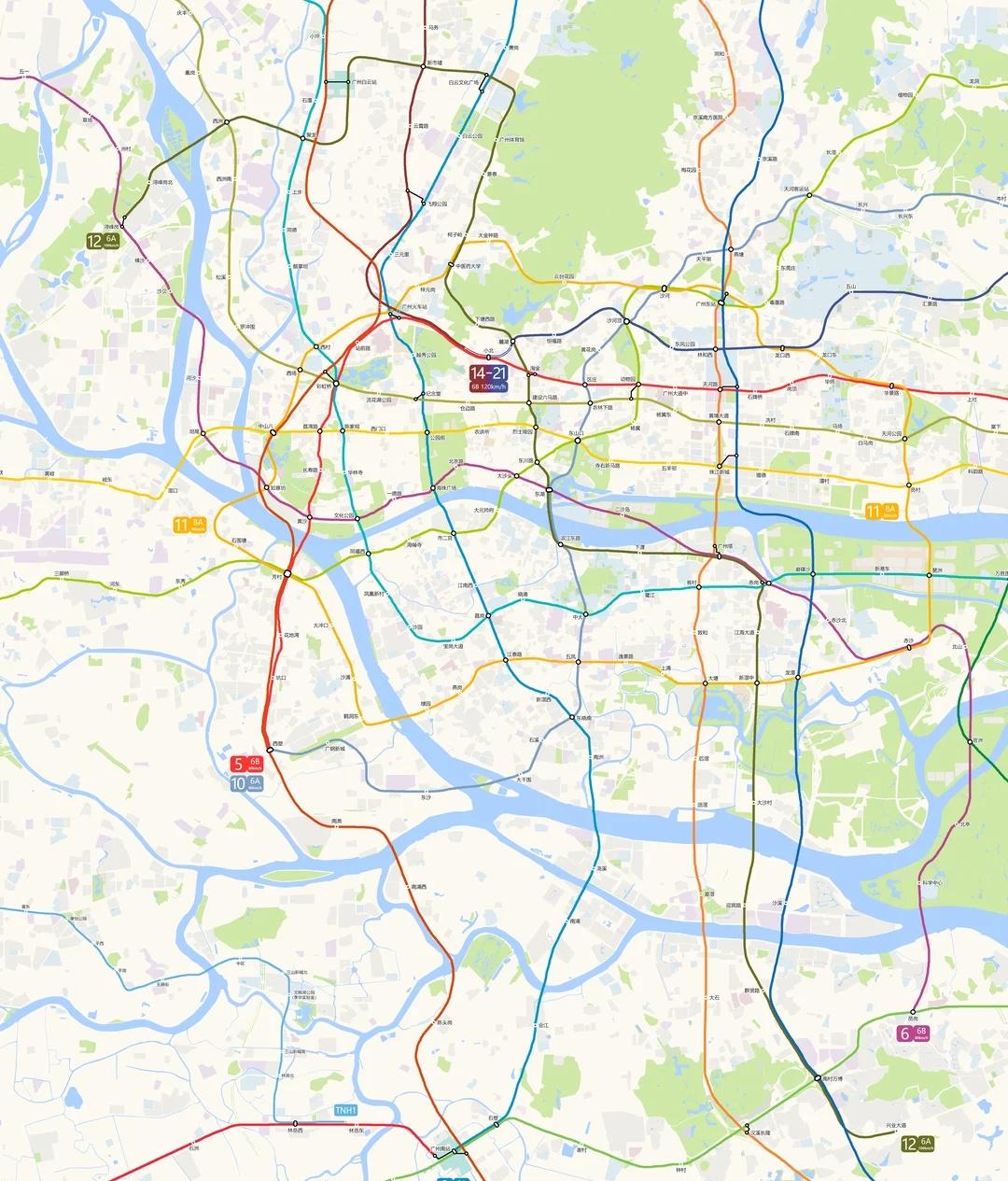 如果把12号线拉直 如图书该架空2027年底线网图。12号线后通段从广州体育馆站出发,沿着现实中12号线的线位(增设下塘西路站)到达东湖,然后向南过江,在滨江东路站和10号线换乘,向东走向赤岗,然后折向南,沿江海大道一路行至番禺区北部。 在新广九方案中,12号线东湖站及以东的线位已经划归了6号线。现实中,人口众多的江海大道沿线缺乏地铁,番禺区的大石街道、南村镇交界处则只有18号线的南村万博站。 因此,该方案让12号线在赤岗南折后一路向南,覆盖江海大道片区和大石、南村片区。江海大道沿线接手现实中规划的19号线的线位,番禺段则接手佛山4号线的线位。考虑到,如果东西走向的佛山4号线在番禺北部设站,沿线居民进站后只能通过换乘3、18这些南北向干线,北上进城上班,反而会增大3号线的压力。因此,让12号线也成为一条连接广州主城区和番禺区的干线,从而起到分流3号线的作用。 在新广九方案中,12号线全线较长,且越秀段以外的部分站距较大,因此为了提高进城效率,选择用100km/h的6A车。 城市交通规划