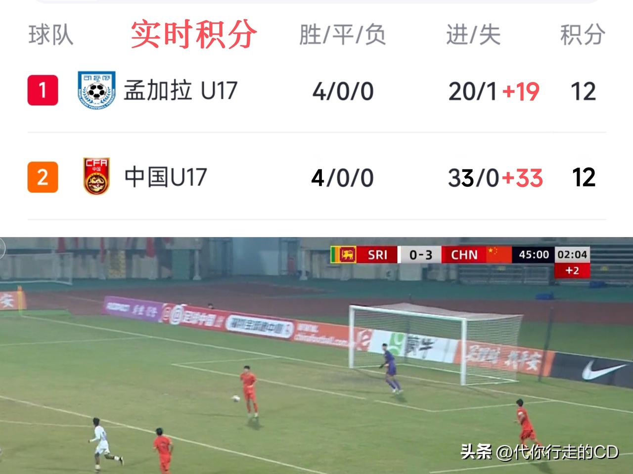 3:0或是30:0,效果一样的! 上半场3:0领先~U17应留力到后天,打平就晋级决赛圈! 在稍早结束的一场比赛中,孟加拉U17以2:1战胜巴林U17,积12分净胜球19个,这意味中国U17只要本场比赛战胜对手,哪怕就赢一个球,就可以反超孟加拉U17拿下小组第一,从而占据出线主动权。 一起聊聊足球 中国U17队