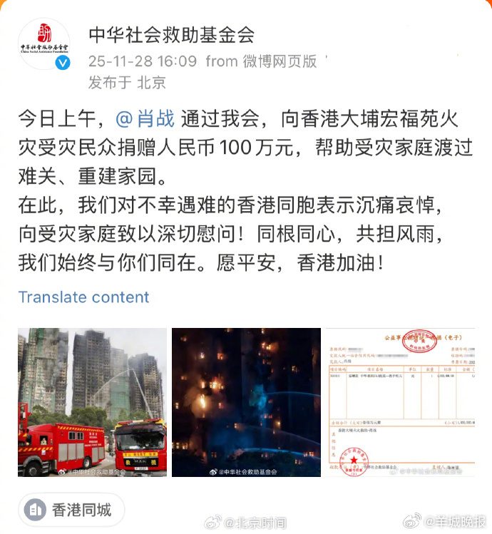 【#肖战为香港捐赠100万# 】#肖战捐100万元# 11月28日上午,通过中华社会救助基金会,向香港大埔宏福苑火灾受灾民众捐赠人民币100万元,帮助受灾家庭渡过难关、重建家园。在此,对不幸遇难的香港同胞表示沉痛哀悼,向受灾家庭致以深切慰问!同根同心,共担风雨,中华社会救助基金会始终与你们同在。愿平安,香港加油!#香港大埔火灾已致128人遇难#(编辑:郑宗敏;审签:岑杰昌)