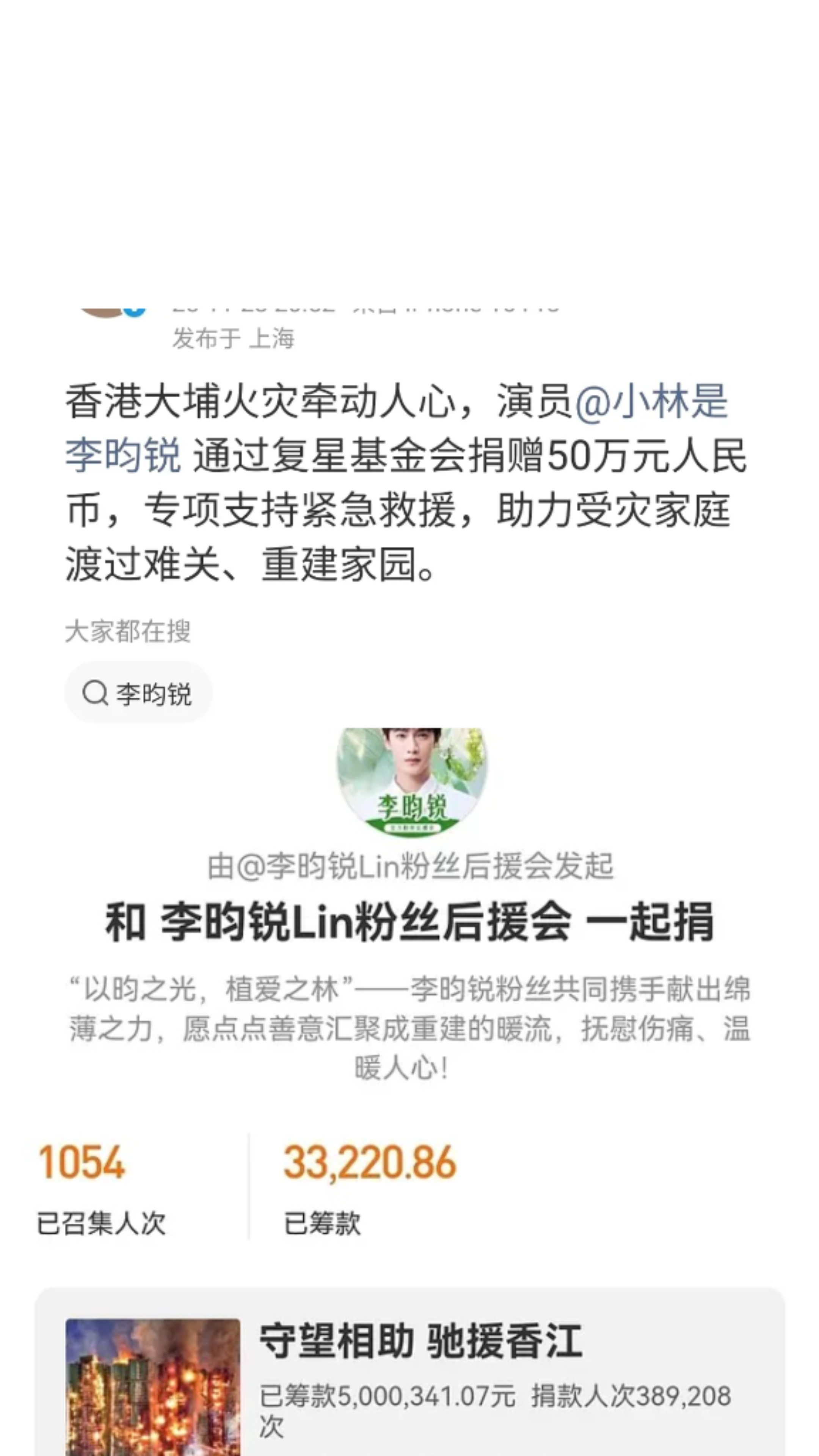 李昀锐为香港捐赠50w,粉丝也在积极募捐,一起驰援香港。