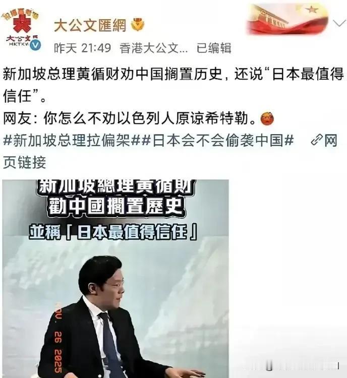 中日剑拔弩张时刻,首先站出来支持高市早苗的不是美国,不是英法德澳加,而是新加坡。 新加坡总理黄循财说日本最值得信任,劝中国应该忘记历史恩怨,东盟国家已经忘记历史恩怨,中国为什么不能呢? 日本蹂躏中国14年,屠杀中国人3500万,忘掉历史恩怨?黄循财你怎么不劝犹太人原谅希特勒,你真应该补习一下抗日战争这段黑暗的历史。 你新加坡没有历史,你没有民族魂魄,一帮海盗投资客搞的国家,你没有归属感,你不会秉持对历史负责的态度尊重原住民 ,但是不要对中国的历史态度指手画脚,中国不是不愿意放下历史仇恨,但是小鬼子要正视自己的罪行,之前中日邦交正常化,中国也是放弃了部分恩怨和赔偿的 。 新加坡,要摆正自己的位置,小国教大国做事会死的很难看!!!