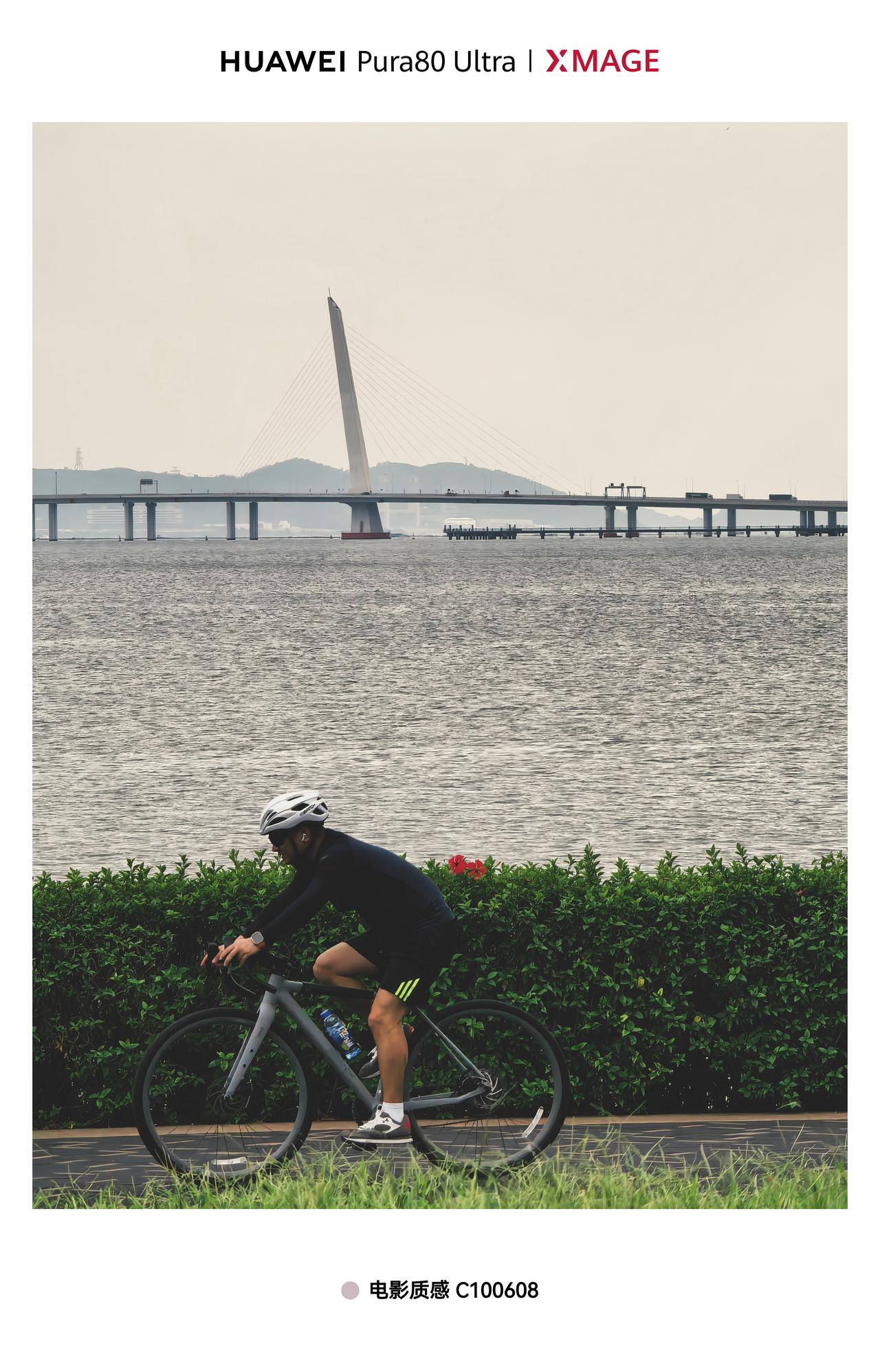 海边散步,拍一张拍一张,骑单的大哥是我的随手拍模特,远处的大桥🌉与山是模特的背景,绿植和草坪间的小径,大哥单车小径过来。华为Pura80ultra一目双镜,10倍定焦拍摄, XMAGE影像电影个性色卡,扫街的快乐