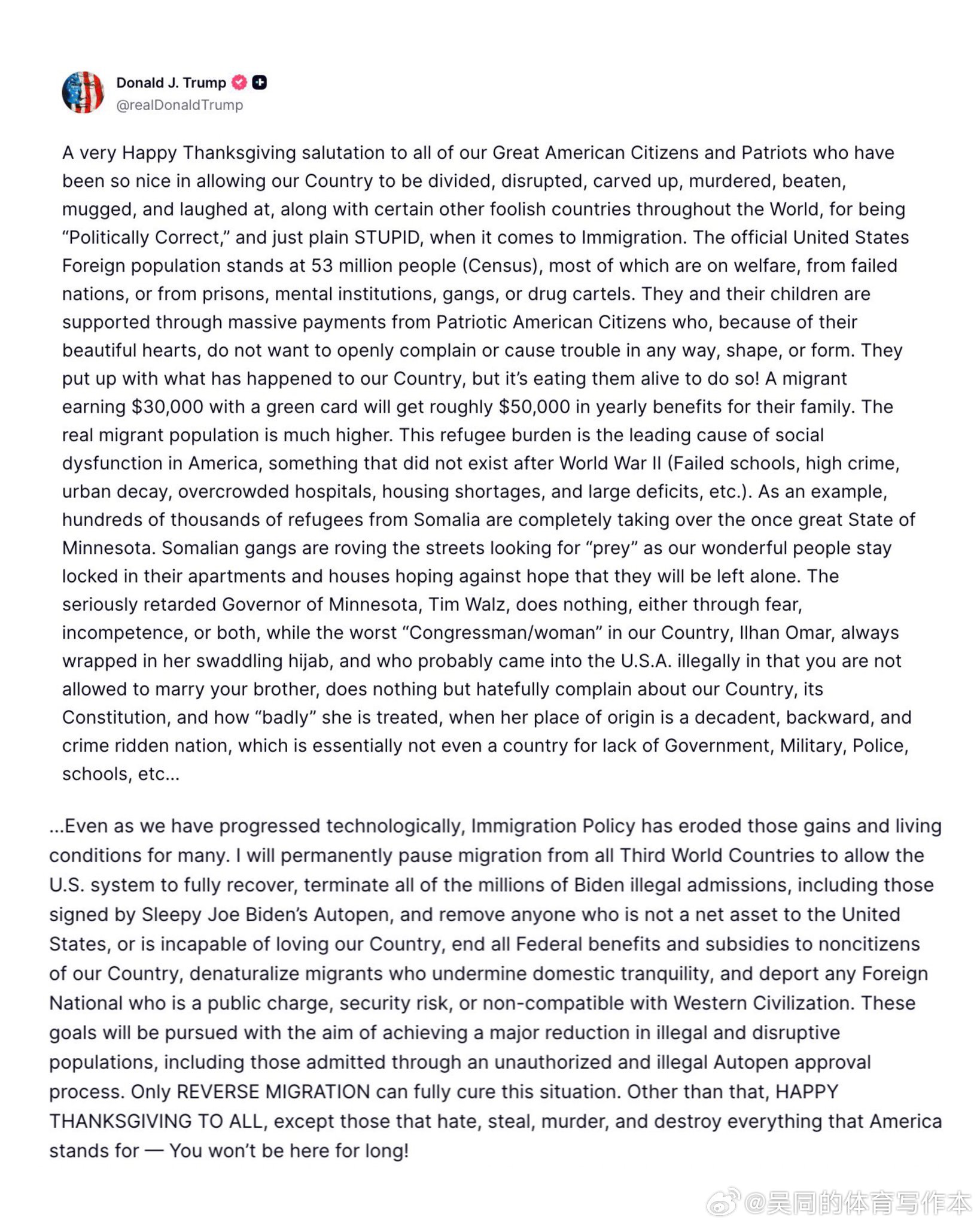 【黄金时代】川普在感恩节,感谢美国人对政治正确的宽容,决心驱逐第三世界移民川普:向所有伟大的美国公民与爱国者致以非常快乐的感恩节问候——感谢你们在国家被分裂、破坏、撕裂、谋杀、殴打、抢劫、被嘲笑的情况下依然如此宽容,就像世界上其他一些愚蠢的国家那样,在移民问题上变得“政治正确”,甚至就是愚蠢透顶。根据人口普查,美国的外国人口已达到 5300 万,其中大多数依靠福利、生于失败国家、或来自监狱、精神病院、帮派、或贩毒集团。他们以及他们的孩子靠美国爱国公民的巨额支付维持生活,而这些爱国者因为善良,不愿公开抱怨,也不愿制造麻烦。但国家发生的事情正在慢慢侵蚀他们的生命。一个持绿卡、年收入 3 万美元的移民,每年可为家庭领取大约 5 万美元的福利。如果算上难民,这个数字更高。这个难民负担是美国社会功能失调的主要原因——这些情况在二战后并不存在(失败的学校、高犯罪率、城市衰败、医院过度拥挤、住房短缺、巨额赤字等)。举例而言,来自索马里的数十万难民几乎占领了过去伟大的明尼苏达州。索马里帮派在街头寻找“猎物”,而我们出色的人民被迫锁在家中,希望他们能被放过。明尼苏达州州长蒂姆·沃尔兹要么因恐惧、无能、或兼而有之而无所作为。与此同时,我们国家“最糟糕的国会议员”伊尔汗·奥马尔,总是裹着她的头巾——她很可能是非法进入美国的,甚至嫁给自己的兄弟——她除了充满仇恨地抱怨我们国家、抱怨宪法之外什么都不做。而当她从那个腐败、落后、遍地犯罪、几乎不能称为国家的地方来到这里后,她却声称受到“非常糟糕的对待”。……即使在科技进步的今天,移民政策却侵蚀了我们曾经拥有的成果与生活条件。我将永久暂停来自所有第三世界国家的移民,以让美国系统得以恢复;终止拜登时代的所有非法入境者,包括那些用“瞌睡乔·拜登”的自动签名批准进入的人;驱逐任何不是美国净资产、或不爱我们国家的人;并取消所有非法移民的联邦福利与补贴。任何公共负担、安全风险、或与西方文明不兼容的外国人都会被驱逐。我们的目标是大幅减少非法与破坏性人口,包括通过未经授权的“自动签名”批准进入的那些人。只有逆向迁移(Reverse Migration)**才能真正解决这一局面。除此之外,祝大家——除了那些仇恨、偷窃、谋杀、并破坏美国一切价值的人以外——感恩节快乐。你们不会在这里待太久!美国和欧洲当代史热点现场海外新鲜事川普主义研究