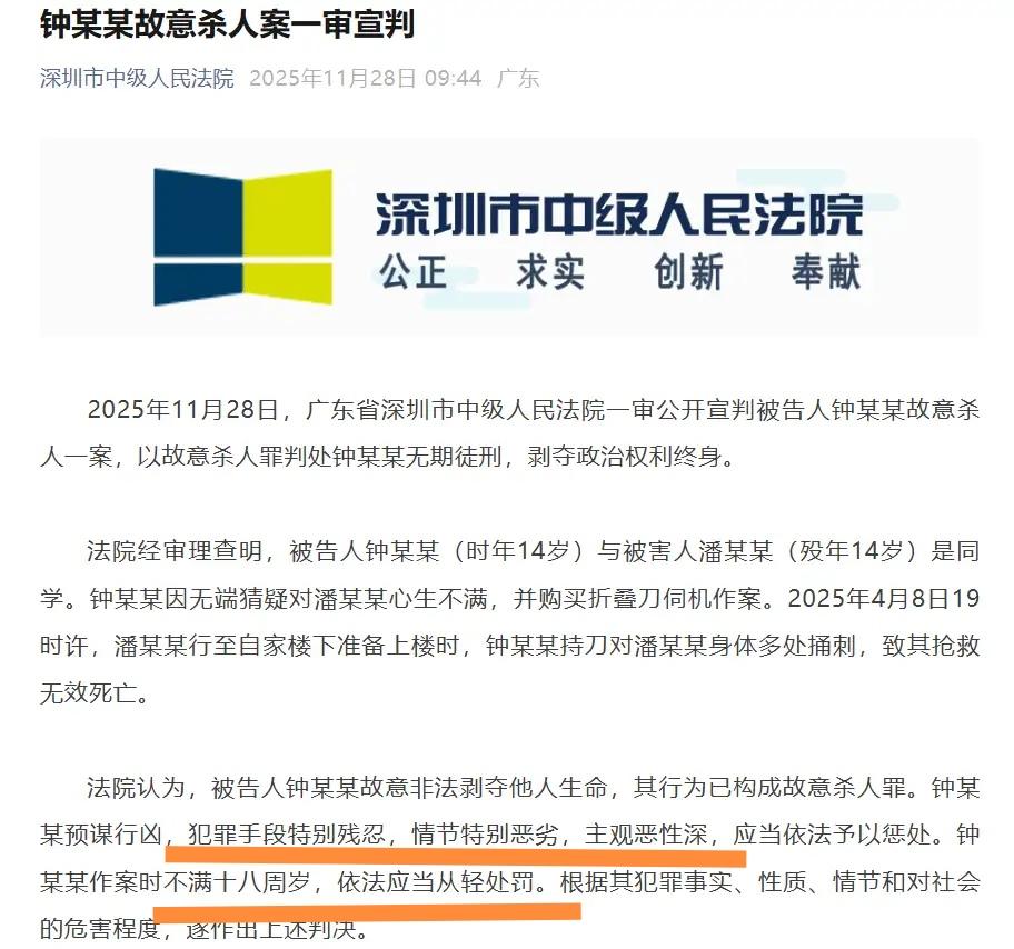 意难平,也无可奈何! 深圳14岁被害女孩妈妈,从宣判现场出来情绪崩溃的嘶喊:“无期不是终身监禁,要抗诉。” 冷静一会,接受采访说了这么一通话:自己是班级群家委,班级群里的消息都从没看到男孩家长回复,说明他家的教育有问题。 小孩犯了法担承不了责任,监护人要担责,没有把自家的小孩教育好。同时表示,判罚结果就是无期,改变不了,希望自己女儿的事能带给大家警示。 据说无期徒刑依然有最低刑期的 ,只要在里面表现好10~15年后就可以申请减刑,然后再服刑8-10年就可以出来,如果在监狱里有立功表现,要不了20年就能出来。 如果她要抗诉,大概率会被驳回,目前无期是未成年最顶格判罚。女孩妈妈免费接送男孩三年,最终换来的是以女儿的生命为代价,好心却换来恶报。 男孩性格内向,三年下来不懂感恩,嫉妒心却越来越重,恨从心头起,恶向胆边生。14岁的孩子,案前精心谋划,案后冷静编造“见义勇为”剧情,心思缜密的让人后背发凉。 一条鲜活的生命就这样没了,幸福家庭就此破碎,“未成年”再次成为逃避法律的理由,受害者也是未成年,她的命也是命,这样的恶魔以后出来了也恐怖! 16岁被害女孩 深圳遇害孩子