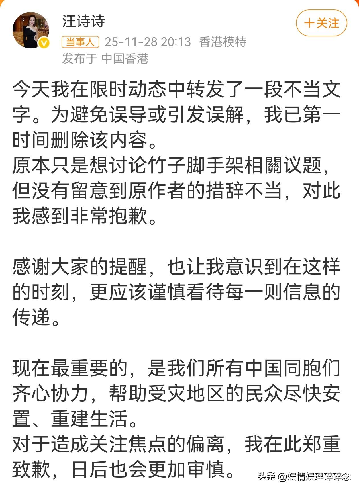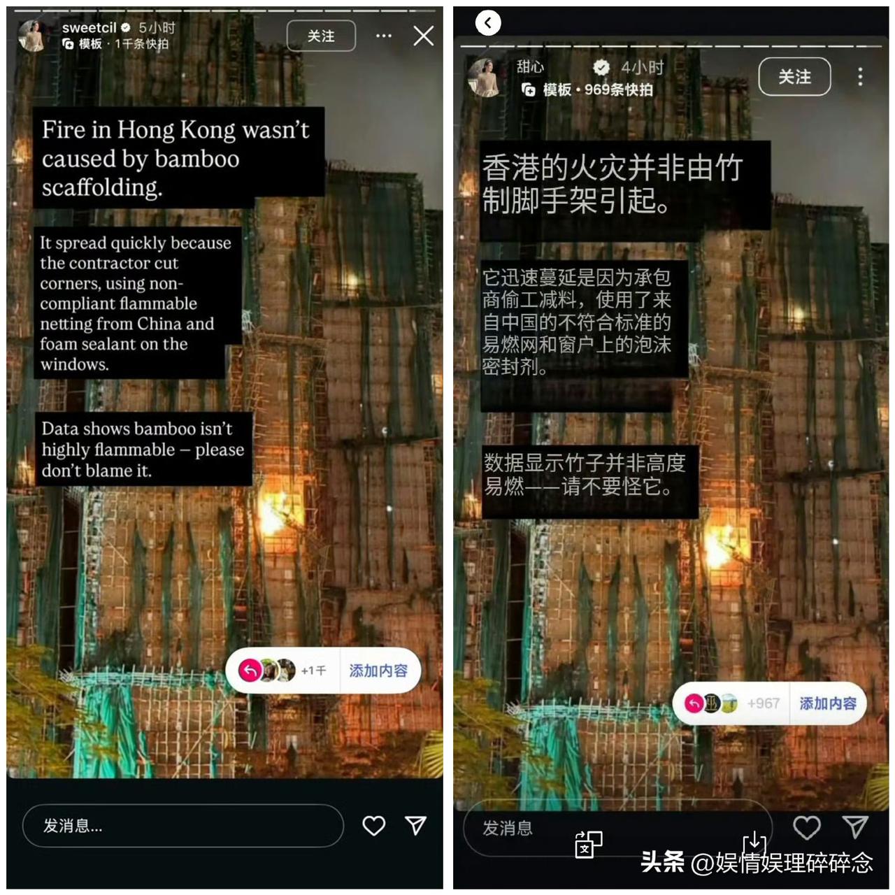甄子丹老婆这是啥意思? 竟然发出这种迷惑言论, 她在社交平台上发文,认为香港的火灾不是因为竹制脚手架引起,而是因为承包商偷工减料,用了来自中国的不符合标准的易燃网和窗户上的泡沫密封剂。 不过随后,她便删除了这条言论,又发文道歉。她说自己转发了一条不当文字,没有留意原作者的措辞不当。但网友不买账了,认为她是“不小心”说出了真心话,只是有人提醒她会影响口碑,才删除的。 香港特区政府保安局局长邓炳强在11月28日的新闻发布会上明确表示,根据火灾初步检查结果,事发大厦的外围棚网保护网达到阻燃要求。火灾的快速蔓延主要归因于高度易燃的发泡胶板以及竹制脚手架的使用。 128条人命摆在眼前,200多人生死未卜,不关心逝者却忙着甩锅,这种舍本逐末的言论,对得起遇难者和牺牲的消防员吗? 甄子丹 汪诗诗