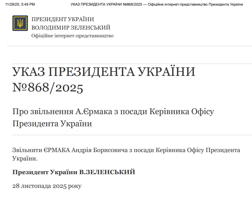 乌克兰总统官方网站发布了2025年11月28日第868/2025 №总统令,解除叶尔马克总统办公厅主任职务。