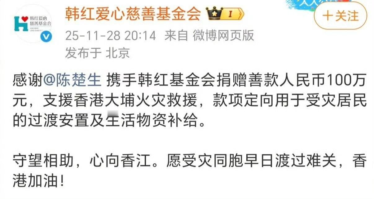 陈楚生捐赠100万元 善意不张扬,担当藏于心!陈楚生捐100万支援香港火灾救援,助力生活安置,多年坚守公益不辍,用温暖回馈社会,这样的正能量艺人,必须被全网看见与认可!
