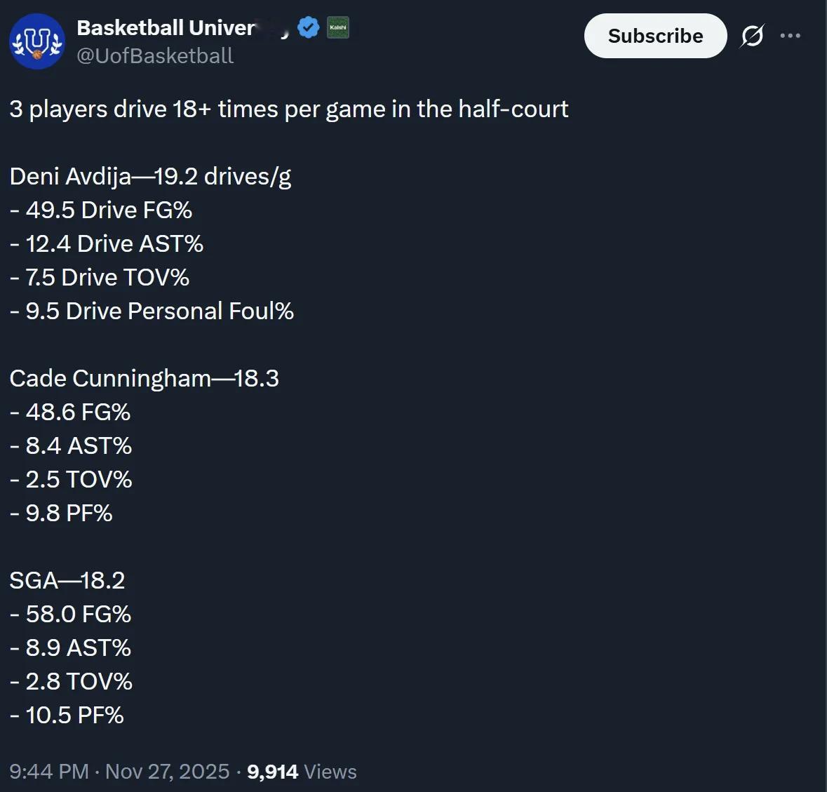 本赛季半场进攻场均突破18次以上的三名球员(亚历山大、阿夫迪亚、坎宁安)数据对比,SGA58%的命中率排名第一,同时拥有2.8%的超低失误率!编辑by蓝色狂潮OKC雷霆10连胜亚历山大强的离谱雷霆