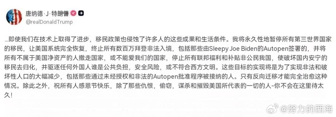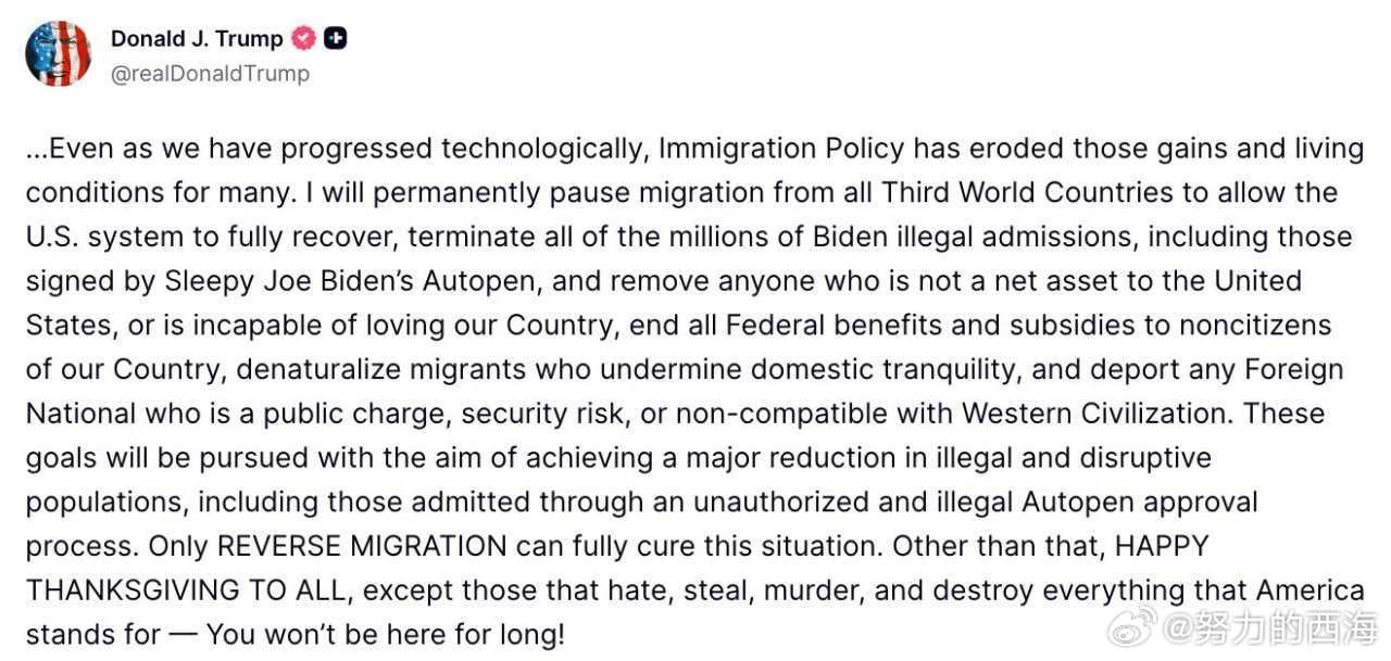 特朗普表示,他的政府计划“永久暂停”来自所有“第三世界国家”的移民。海外新鲜事热