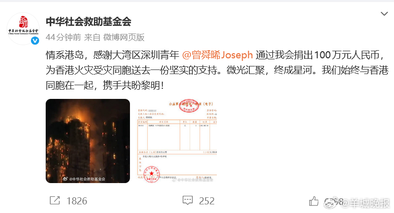 【#曾舜晞向香港捐款100万#】#曾舜晞捐款100万元#11月28日,大湾区深圳青年通过中华社会救助基金会,向香港大埔宏福苑火灾受灾民众捐赠100万元人民币,为香港火灾受灾同胞送去一份坚实的支持。微光汇聚,终成星河。我们始终与香港同胞在一起,携手共盼黎明!#香港大埔火灾已致128人遇难#(编辑:郑宗敏;审签:岑杰昌)
