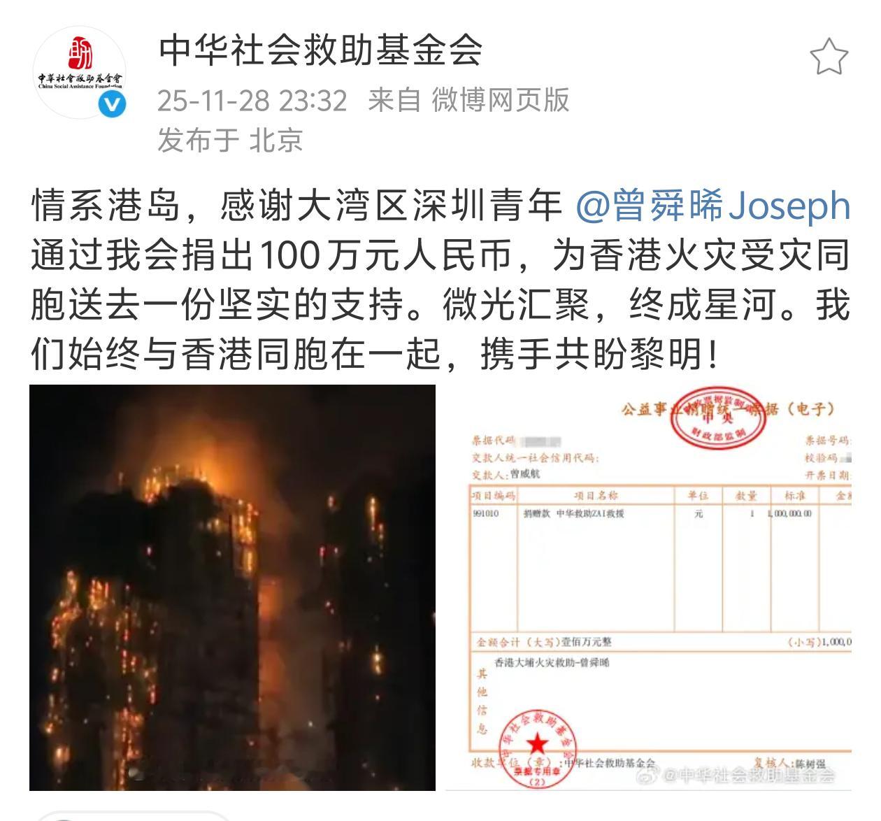 大湾区演员青年演员曾舜晞通过中华社会救助基金会向香港捐款100万元,一起为香港