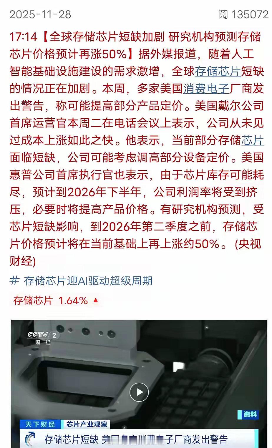 光互联产业真是好到爆了光器件紧缺,走出来了长光,源杰,永鼎这些供光器件的企业,那么今天有一家的隔离器法拉第旋光片东田微也20%涨停了。其实主要是光隔离器里面的法拉第旋片紧缺,本质还是因为这个光模块的供需拉动太快了,导致产业链上下游都更不上这个扩产速度,所以谁拿到物料谁就能获得CSP的订单。目前这个法拉第旋片,已经从120刀涨价了接近50%到180刀了。明年光模块的需求特别是1.6T,一定是大于供给的,因为现在的供应链完全无法消化这些产能,包括中际。即使中际全部扩产放量,但依然满足不了市场的总需求,所以就会有新易盛替补的称号,谁有缺口他补上,还有剑桥这些,明年他们日子都会很好过。最后说一下存储,调整了好长一段时间了,感觉也调整差不多了,今天香农芯窗事流入了很多资金,收盘前我也开了新仓试错,博下周一二的反弹。收盘发了存储的利好,配合周末发酵亿波,是不是下周一会比较劲爆。全球存储芯片短缺加剧,研究机构预测存储芯片价格预计再涨50%。据外媒报道,随着人工智能基础设施建设的需求激增,全球存储芯片短缺的情况正在加剧。本周,多家美国厂商发出警告,称可能提高部分产品定价。戴尔表示,从未见过存储成本上涨如此之快。当前部分存储芯片面临短缺,公司可能考虑调高部分设备定价。惠普表示,由于芯片库存可能耗尽,预计到明年下半年,公司利润率将受到挤压,必要时将提高产品价格。有研究机构预测,受芯片短缺影响,到明年第二季度之前,存储芯片价格预计将在当前基础上再上涨约50%。