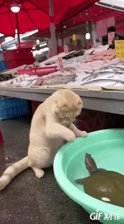 “真是好奇害死猫!”一只猫咪走到鱼摊,看见地上盆里的甲鱼探着脑袋,直接伸爪子拍它