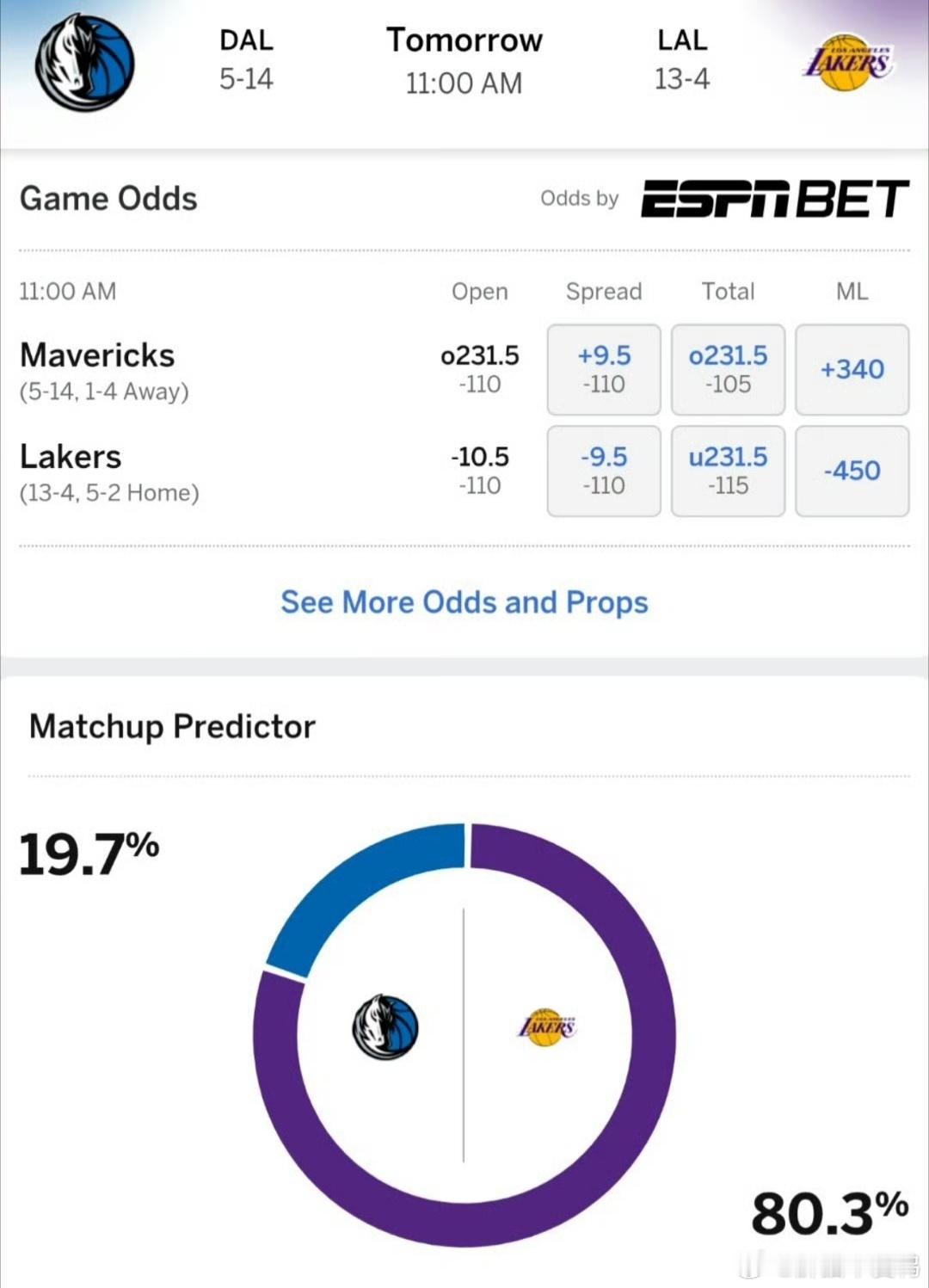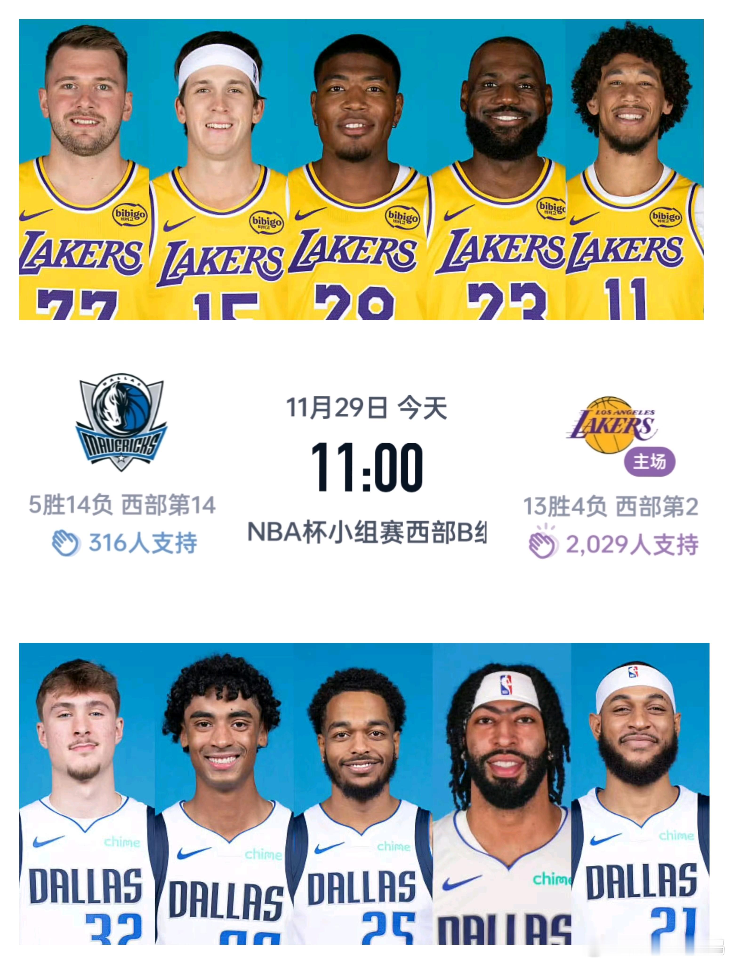 芜湖!明天湖人比赛来了!湖人主场迎战达拉斯独行侠!东契奇浓眉互战旧主!詹姆斯复出第四战!这场比赛也是双方NBA杯小组赛的第4场,目前湖人已经出线了,独行侠大概率是陪跑了!ESPN这次预测湖人胜率高达80.3%,而独行侠只有可怜的19.7%!不知道为什么每次把湖人胜率搞得高高的,就是感觉会翻车!湖人在老詹复出后三战全胜!目前以一波五连胜取得13胜4负排名西部第2!而独行侠这边,因为伤病以及球员的状态战绩只有可怜的5胜14负排名西部第14!湖人在最近5场比赛都取得胜利,老詹复出后效果立竿见影,三核发动机各司其职!而独行侠最近5场只赢了一场,还是败给了伤病,以及阵容的调整问题,这状态等欧文回来了都难带阿!双方首发独行侠这边弗拉格,克里斯蒂,PJ华盛顿,浓眉(复出),加福德湖人这边东契奇,里夫斯,八村垒,詹姆斯,海斯双方伤病情况:艾顿(右膝挫伤)大概率出战!斯玛特(背部痉挛)出战成疑!戴维斯(左小腿拉伤)出战成疑!欧文、莱夫利、艾克萨姆因伤缺阵!双方攻防效率湖人均占优势!湖人进攻效率排联盟第九位,而防守效率排联盟第十六位!老詹复出后,湖人的进攻效率上涨了不少!但是防守还是他们的弱环!独行侠在攻防两端可谓是完全畸形!进攻效率联盟垫底,而防守效率居然高居联盟第三!说白了,独行侠这阵容还是可以的,只是进攻问题影响太大了!湖人詹姆斯独行侠艾顿NBA达拉斯独行侠芜湖洛杉矶湖人