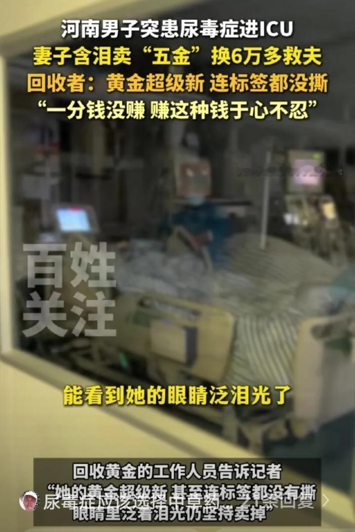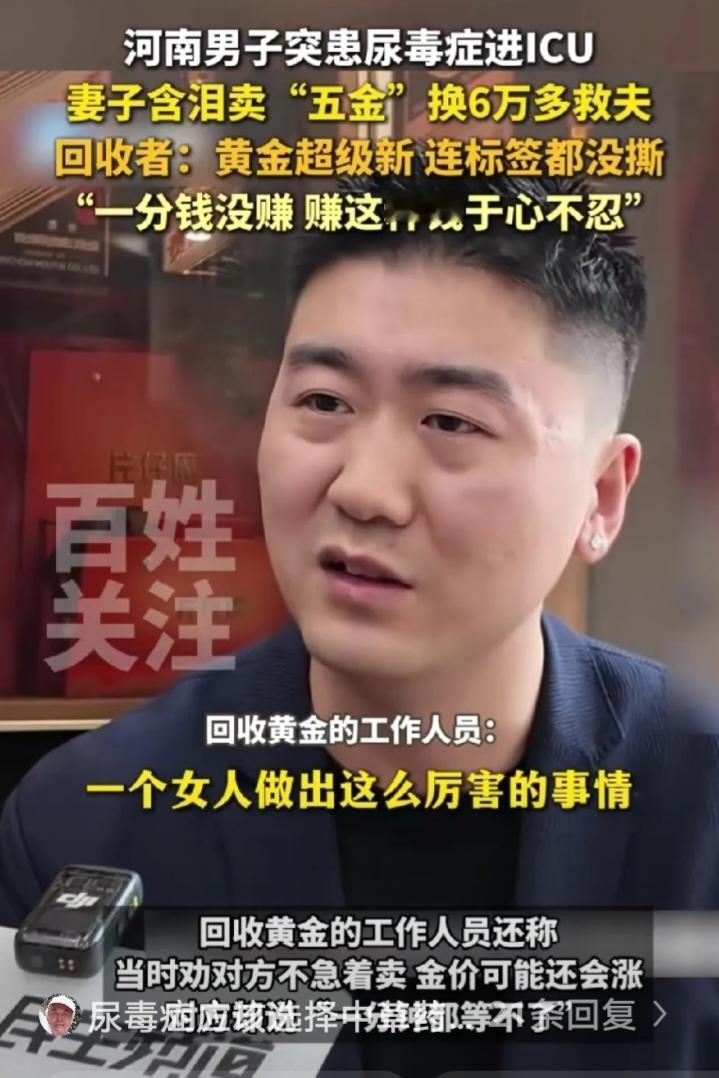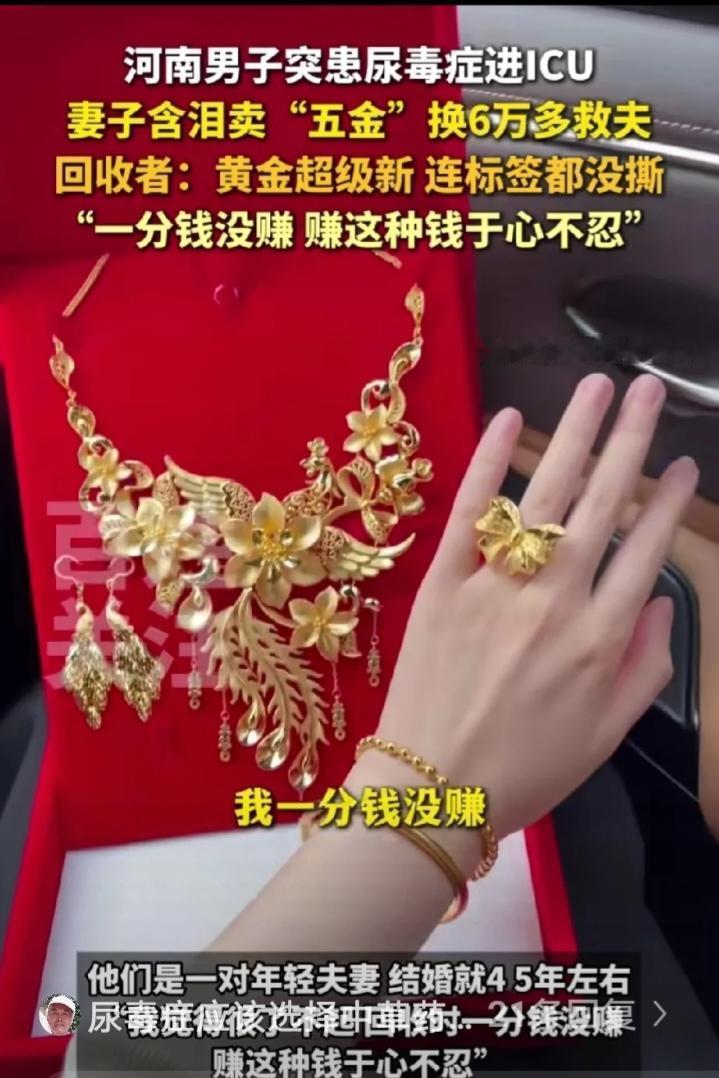 河南一对新婚小夫妻,丈夫突然患上尿毒症被送进ICU抢救。新婚不久的妻子,拿着崭新、标签都还没撕掉的金首饰,急匆匆的去售卖。 回收店里,老板看着金首饰,问道:“这么新,都没戴过,为啥急着要卖呀?金价还会涨的。”妻子眼眶含泪,答道:“我丈夫生病了,急需医药费。先卖金首饰,再卖房与车,我只求他能活着,恢复健康。” 老板心情沉重的称了金首饰的重量,说:“总共能卖6.5万元,我按正常金价回收,一分钱都不赚你的。”妻子瞬间愣住,随即泪水夺眶而出,赶忙对老板连声道谢。 事后,回收店老板感慨道:“这个女人太了不起了,赚她的钱,我心里过意不去。”回收店老板的义举令人赞叹。虽不能给予她太多帮助,但他绝不去赚他人救急的钱。 新婚不久,二人尚无共同的孩子,妻子为了丈夫的病,倾尽全力筹集医药费,这份深情与担当让人动容。婚姻并非为了彩礼、五金,更不是为了面子,而是因相爱才选择相伴。相爱的人,会携手走过人生的风风雨雨。 病痛这东西真挺狠的,专挑最脆弱的时候给生活出难题。可这位妻子愣是用自己的肩膀扛了下来,没半点犹豫就卖掉了珍藏的金首饰,还想着要卖房卖车,眼里只有“让丈夫活着”这一个念头。 她日夜守在ICU外,熬红了眼也不肯歇,这份不离不弃的陪伴,就是丈夫对抗病魔最硬的底气。老板不赚救命钱的做法也暖到心坎里,善良从来都不是要做多大的事,而是在别人难的时候不添堵、不占便宜。 现在好多人觉得婚姻离不开物质,可这对小夫妻用实际行动证明,真爱就是不管遇到啥坎,都愿意为对方拼尽全力。爱情最好的模样,不就是你病了我守着,你难了我陪着吗?各位读者你们怎么看?欢迎在评论区讨论。