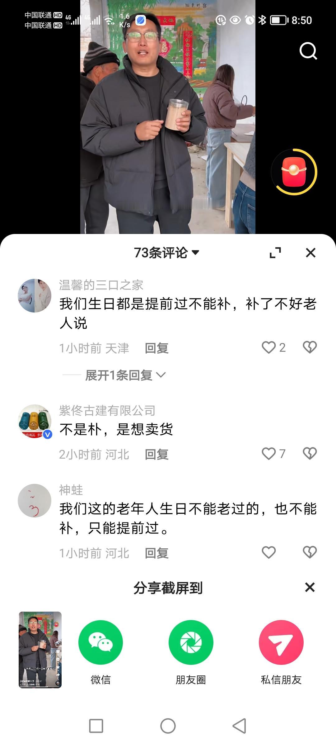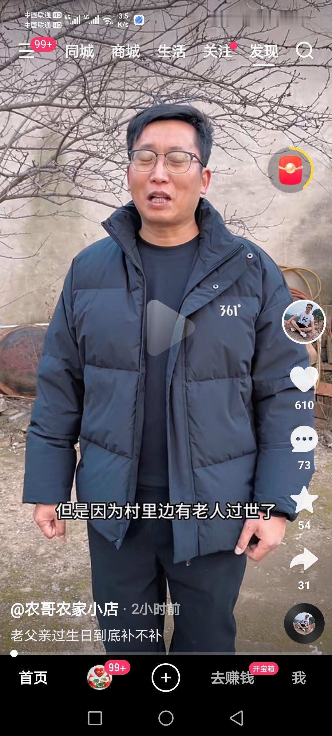 网红农哥今天乐了! 11月26日给父亲过80岁生日,届时直播全过程。内丘县网红农哥在自己的抖音号上提前打出了预告。 没想到,昨天农哥和姐夫常熟他们去拔白菜,常熟骑着电三轮翻车了,趁着这个档口,老爷子和儿女们说,今年的生日不过了。陈红来电话说他奶奶去世了,逝者为大。 一听这话,农哥的脸刷的一下变了:做八十大寿的预告早就发出去了,带货也安排好了,你这一个不做了,不是打我的脸吗? 今天农哥又发了视频,视频里他母亲说按照习俗过生日一次过年年过,如果有特殊情况耽误了,还可以补! 农哥一听立时如同打了鸡血,立马开始宣布,老父亲生日活动明天举行,然后拿出了明天要卖的酸枣仁粉,还有361的鞋子,兴致勃勃的讲解起来…… 唉,这哪是给父亲做寿,不就是卖货挣钱吗?