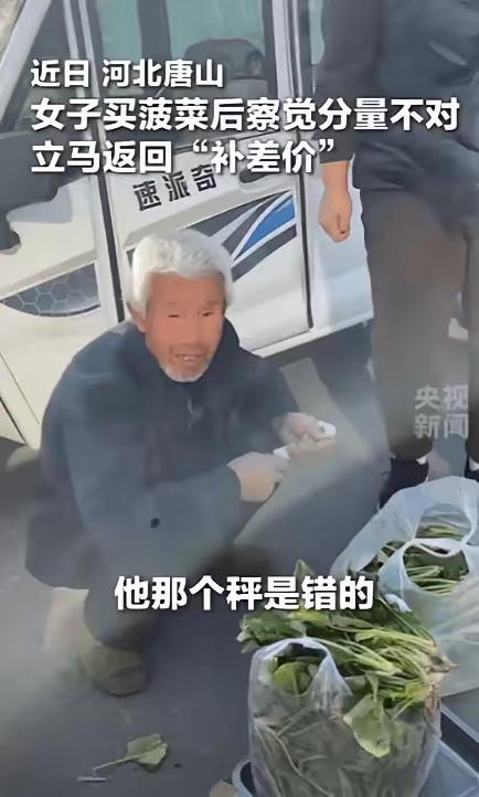 唐山大姐赶集遇"秤错",返回补钱还教老人用秤,央视点赞全网暖心 晨雾未散的唐山玉田县金玉市场大集,70多岁的老人佝偻着背,守在角落的摊位前。旧棉袄袖口磨出毛边,布满老茧的双手小心翼翼地将带着晨露的菠菜摆得整齐,2元一斤的价格比超市便宜近半,吸引了不少赶集人。 邵辰辰骑着电瓶车路过,被水灵的菠菜吸引,随口问价后便让老人称一斤。老人麻利装袋、放上电子秤,指着显示屏说"一斤整",邵辰辰扫码付了2元,提着袋子继续赶集。可没走多远,她就觉得手里的袋子格外沉,比平时买的一斤菠菜饱满不少,单手拎着都有些费劲,心里泛起了嘀咕。 到家后,邵辰辰第一时间把菠菜放到自家弹簧秤上,指针稳稳停在"2斤"刻度。"坏了,老人肯定把公斤秤当成市斤秤用了!"她心里一紧,想着老人这么大年纪出来卖菜不易,这么卖下去得亏多少,顾不上喝口水,拎起菠菜就往集市赶,路上还盘算着怎么委婉说明,不让老人误会。 回到集市,老人正在给一位阿姨称菜,邵辰辰走上前轻声说:"大爷,你这秤不对!"话音刚落,周围刚买过菜的人都停下脚步,目光齐刷刷投了过来。老人愣了愣,眼神里透着慌张,下意识摸了摸口袋里的零钱。邵辰辰赶紧解释:"大爷,您这是公斤秤,显示1就是2斤,我买一斤却多拿了一斤,特意回来补钱的!" 听清缘由,老人松了口气,连连摆手说"不用补",脸上露出不好意思的笑容。但邵辰辰坚持点开手机转了2元,周围的顾客也反应过来,纷纷给老人补付了差价。随后,邵辰辰蹲下身,指着电子秤的按键耐心教老人:"这个是公斤键,这个是市斤键,称的时候按一下这个就对了",一边说一边反复演示,老人凑着脑袋仔细看,不停点头。 "老人家这么大年纪出来卖菜不容易,哪能占这便宜",面对周围人的夸赞,邵辰辰笑着说道。老人看着她,眼眶微微发红,嘴里不停重复着"谢谢"。 邵辰辰随手将此事拍成短视频发到网上,没想到几天内就火爆全网,连央视新闻都转载报道。网友们纷纷留言点赞,有人说"换作自己可能根本发现不了",也有人打听老人的摊位位置,想过去照顾生意,一场小小的"秤错风波",最终变成了传递善意的温暖故事。