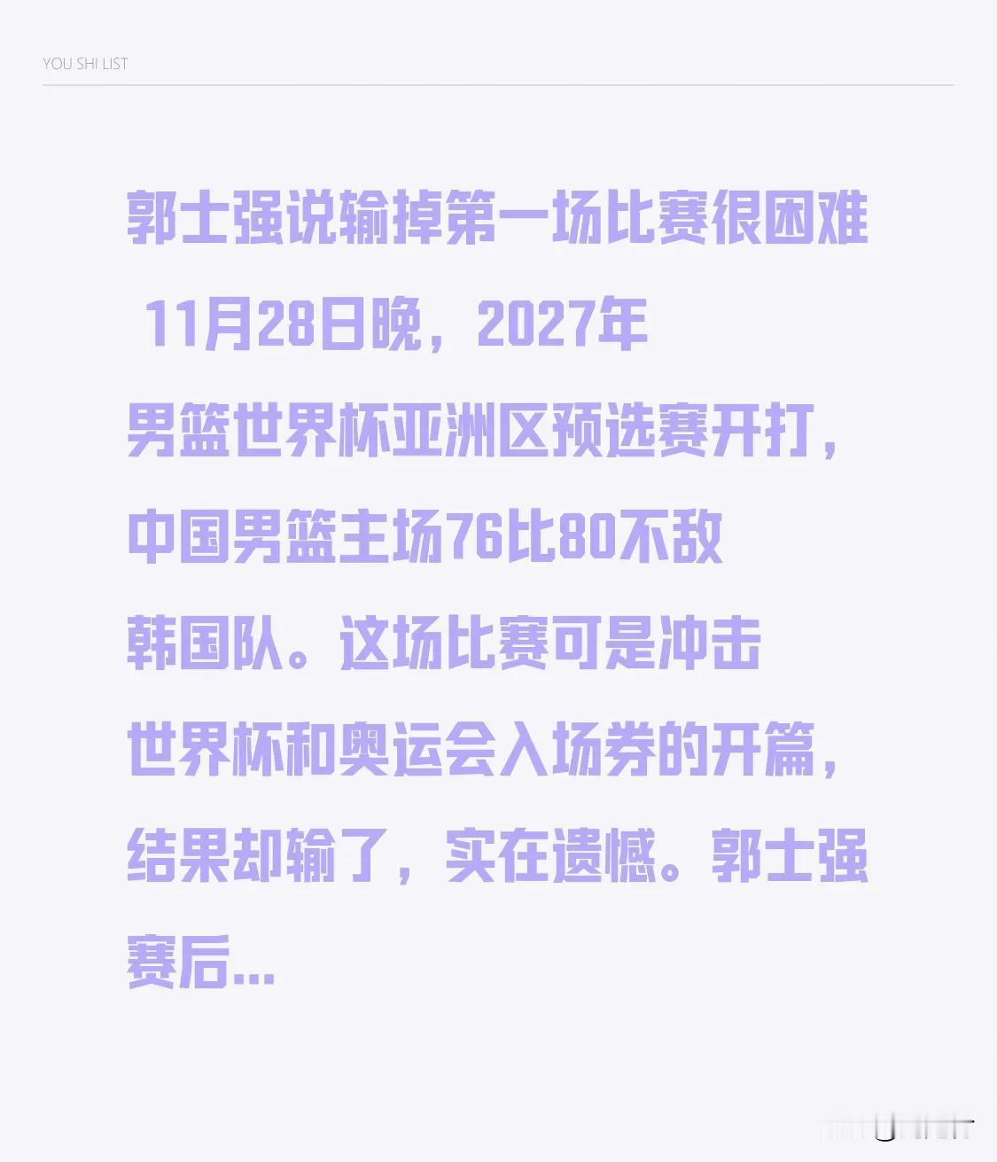 郭士强说输掉第一场比赛很困难 郭士强称首战失利挑战大 11月28日晚 2027年男篮世界杯亚洲区预选赛启幕 中国男篮主场76比80惜败韩国队 此役乃冲击世界杯与奥运会入场券之开篇 却以失利告终 着实令人惋惜 郭士强赛后坦言 首战落败困难诸多 未能限制对手特点 如三分与快攻 上半场 中国队外线9投1中 韩国队15投9中 李贤重一人外线8投6中 下半场 中国队奋力追分 却回天乏术 不过 三天后的客场之战至关重要 12月1日18点 男篮将在客场再度迎战韩国队 望其及时调整 打好这场关键之役 广州广东男篮 郭士强 男篮教练对比 郭士强教练