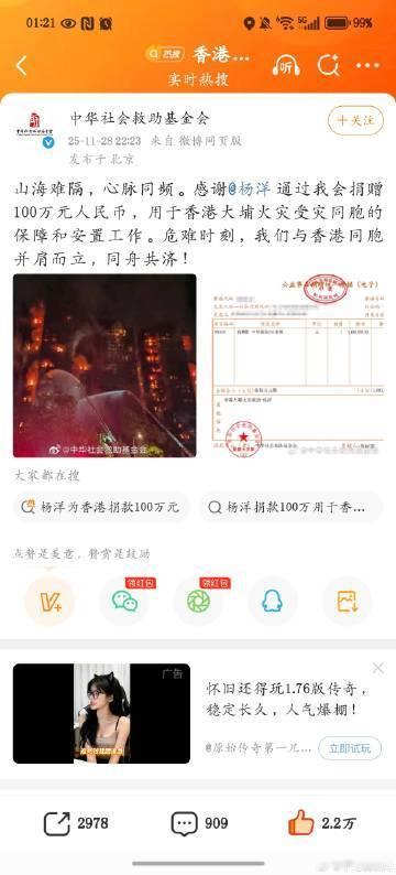 杨洋为香港捐款100万元默默捐出百万支援灾区,用行动传递温暖,这份雪中送炭的情义,让 “山海同源,守望相助” 不再是口号