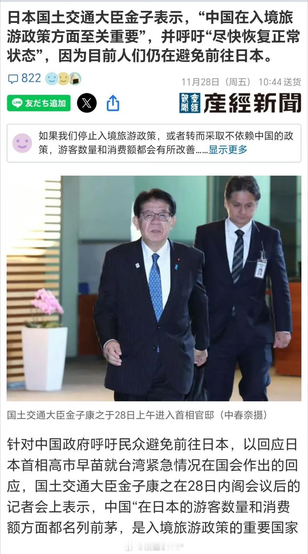 日本国土交通大臣金子恭之还想中国人去旅游。