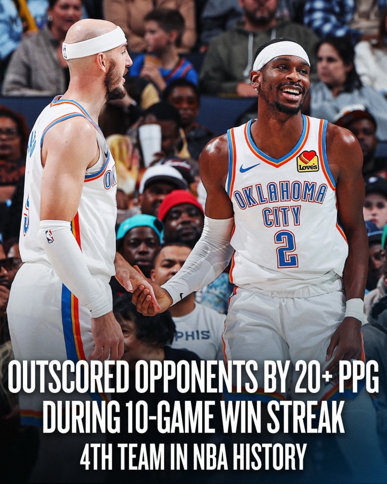 NBA官方发帖吹你雷:在10连胜期间,雷霆场均得分比对手高出20+分,这是NBA历史上第四支达成此成就的球队!雷霆10连胜亚历山大强的离谱雷霆