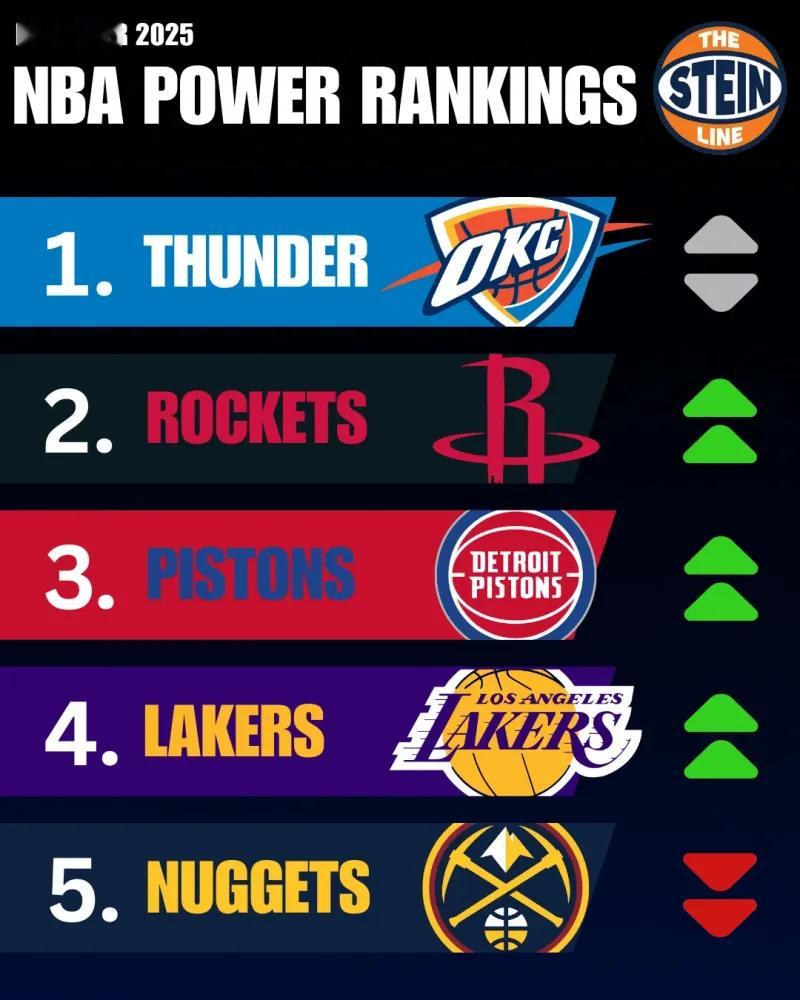 知名篮球记者Marc Stein更新了自己的最新一期球队实力榜,其中排名前五的队伍为雷霆,火箭,活塞,湖人,和掘金。