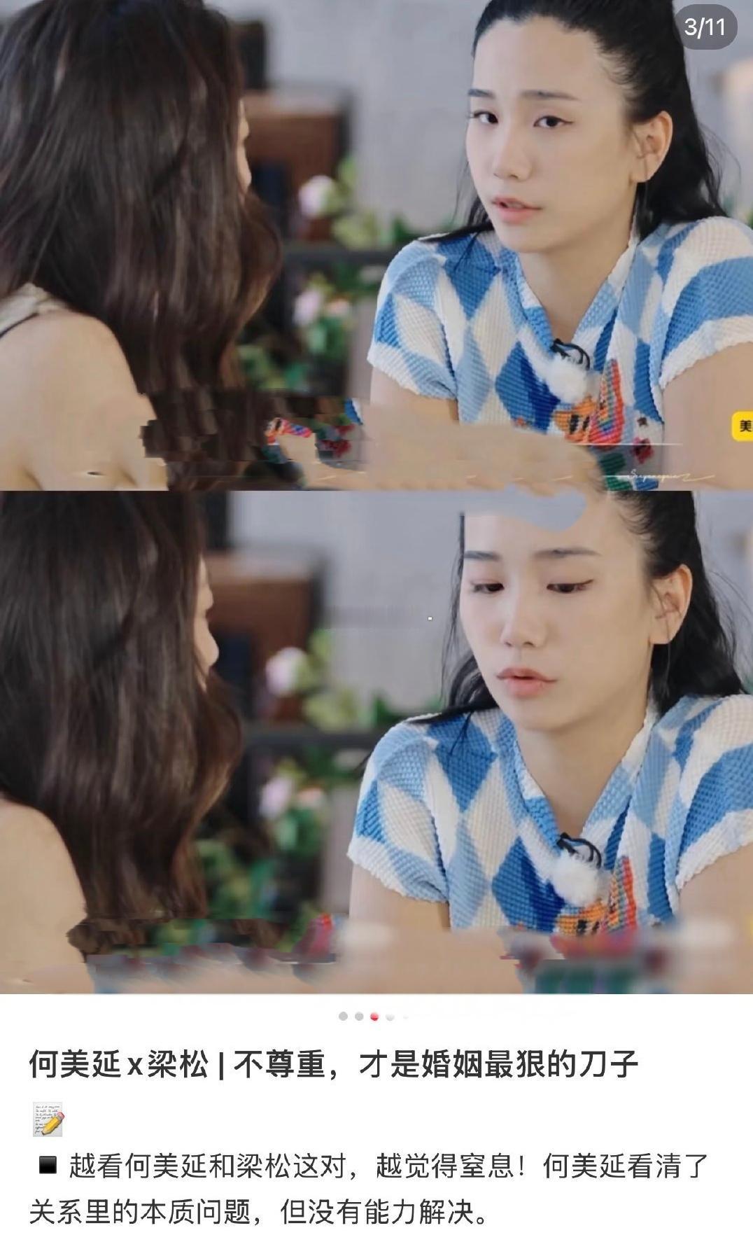 何美延梁淞:这就是语言的艺术 在《再见爱人5》中,何美延与梁淞的互动,堪称一场关于语言艺术的“精彩博弈”。梁淞母亲那番“明贬实褒”的言论,尽显高明。她看似全在责备儿子,实则句句将矛盾指向何美延,把何美延的敏感、懒惰等问题归咎于其原生家庭,还巧妙地用“不拜金”等优点,将何美延置于一个看似有瑕疵却又有闪光点的位置,让何美延一度坚信婆婆是自己的底气。 而梁淞本人,在与何美延的争吵中,更是将语言艺术发挥得“淋漓尽致”。他情绪输出时,惯用中英文混杂的激烈言辞压制对方,一句“又坏又蠢”的极端贬低,瞬间点燃何美延积压已久的情绪,使其陷入崩溃。反观何美延,她能把心里想法、委屈和道理,条理清晰地像唱rap一样说出来,将复杂情绪和逻辑梳理得明明白白,在面对矛盾时清醒且有力量地自证。 这场语言交锋,不仅展现了两人婚姻中的矛盾,更让我们看到,语言既能成为维系关系的桥梁,也可能化作伤人的利刃。
