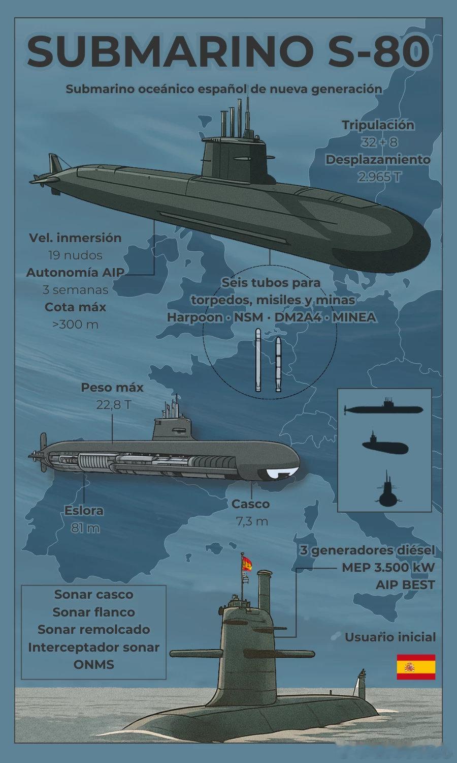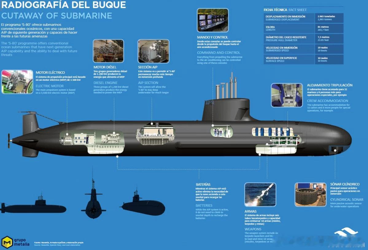 S-80 级潜艇解析——西班牙海军史上最大规模的自主国防工程S-80 级潜艇是西班牙自主设计与建造的新一代常规动力远洋潜艇,标志着西班牙在水下作战平台领域的技术突破。其核心优势在于采用了第三代 BEST(Bio-Ethanol Stealth Technology)AIP 系统,即生物乙醇隐身技术,具体流程包括:通过生物乙醇重整装置制取氢气;氢气与氧气在燃料电池中反应生成电力;在潜航状态下可连续运行最长三周,显著提升隐蔽性与续航能力。该级潜艇实现了高度自动化,搭载由 Navantia 公司开发的最新综合平台控制系统,标准船员配置为 32 人,并可搭载 8 名额外任务人员。性能参数指标 数值全长 81 米船体直径 7.3 米潜航排水量 2,965 吨最大起飞重量 22.8 吨乘员 32 人 + 8 人潜航速度 19 节水面航速 10 节水面航程 最长 60 天AIP 潜航自主性 最长三周最大潜深 > 300 米作战系统S-80 级潜艇配备由 Navantia 与美国洛克希德·马丁公司联合研制的先进作战系统,具备以下多任务能力:战术对地导弹发射能力(为北约与欧盟中唯一具备该能力的常规潜艇);执行水面作战、反潜作战及对陆打击任务。主要武器与传感器配置:6 具 533 毫米鱼雷发射管,兼容鱼雷、导弹及水雷;反舰导弹:波音“鱼叉”;制导鱼雷:Atlas Elektronik DM2A4;智能水雷:SAES Minea;对陆攻击导弹:康斯伯格 NSM;声纳系统:由洛克希德·马丁与 SAES 联合提供,包括主/侧扫声纳、导航声纳与拖曳阵列声纳。动力与推进系统主推进电机(MEP):功率 3,500 kW;柴油发电机组:3 组,每组输出 1,200 kW,用于充电与水面供电;AIP 系统:BEST 生物乙醇隐身技术,大幅提升水下持续潜航能力。发展历程S-81 “艾萨克·佩拉尔”号:2023年11月服役;S-82 “纳尔西索·蒙图里奥尔”号:预计2025年11月下水;S-83 “科斯梅·加西亚”号:2024年安装首套 AIP 系统,计划2027年服役;S-84 “马特奥·加西亚·德洛斯雷耶斯”号:预计在 S-83 服役两年后加装 AIP 系统并交付;S-81 与 S-82 的 AIP 系统将在后续入坞维修阶段进行加装。S-80 项目原计划建造 4 艘潜艇,是西班牙实现潜艇全周期自主研制的重要里程碑。Navantia 公司作为项目的技术主导方,不仅提升了西班牙国防工业的技术水平,还每年为国内 GDP 贡献约 2.1 亿欧元,并直接或间接创造约 5,000 个就业岗位。飞扬军事 烽火问鼎计划 每天认识一件兵器