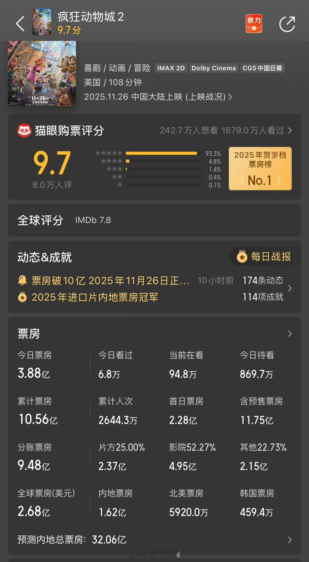 疯狂动物城票房杀疯了!疯狂动物城2中国内地周六票房狂收7.38亿元/1.043亿