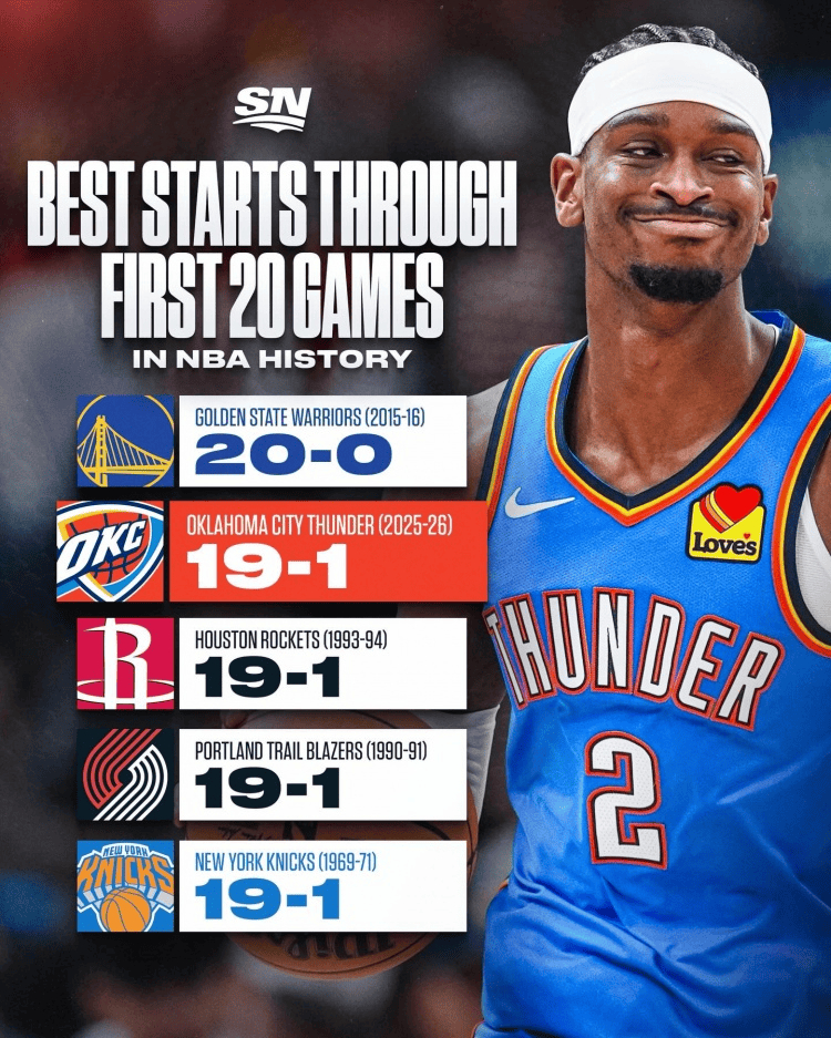 NBA那点事今天雷霆123-119力战胜太阳后,已经豪取十一连胜,战绩来到19胜1负,此战绩仅次于2015-16赛季的勇士,与三队并列历史第二:1、2015-16赛季勇士(20胜0负)2、2025-26赛季雷霆(19胜1负)2、1993-94赛季火箭 (19胜1负)2、1990-91赛季开拓者(19胜1负)2、1969-70赛季尼克斯(19胜1负)雷霆vs太阳雷霆