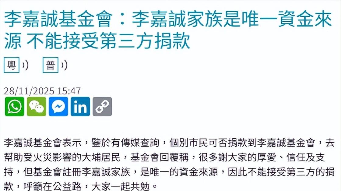 李嘉诚捐8000万后再发声:不接受第三方捐款,家族是唯一资金来源 2025年11月26日,香港突然发生大火,好大的火,烧了好久好久,死了好多人,一百二十八个,所有人一下子都懵了,社会各界都震惊了,太突然了。 捐款开始了,好多人捐钱,内地的,香港的,大家都好心,总共捐了十几亿港币,好多钱,真的,感觉暖暖的,都是同胞啊。 李嘉诚也捐了,八千万港币,可是,有人说,这是第三方捐款,什么意思呢,李嘉诚基金会说,不是的,钱都是李嘉诚家族的,不收外面的钱,保证捐款很干净,大家都在想,这到底是怎么一回事。 李嘉诚基金会,好多年前就开始捐钱了,1980年,到现在,捐了三百多亿港币,好多好多,内地也捐,2023年,甘肃地震,捐了两千万,华东水灾,捐了三千万,真不少,李嘉诚退休后,把自己的钱,三分之一放进基金会,周凯旋管着,一直做慈善,确实不错。 刘銮雄也一样,他的家族也捐钱,不公开募捐,怕麻烦吧,所有钱,都是自己的,香港的大家族,虽然没以前那么厉害了,但是,捐钱的时候,一点都不含糊,李兆基家族也捐了,郑裕彤家族,郭德胜家族,还有霍英东家族,邵氏基金会,都在出力。 内地这边呢,也来了,好多企业,好多明星,捐的钱,比香港艺人还多,韩红基金会捐了一千万,真不少,李连杰,向华强夫妇一起捐了三百万,也是一份心意,很多人看完这个故事,都会去想,以后会更好吧。