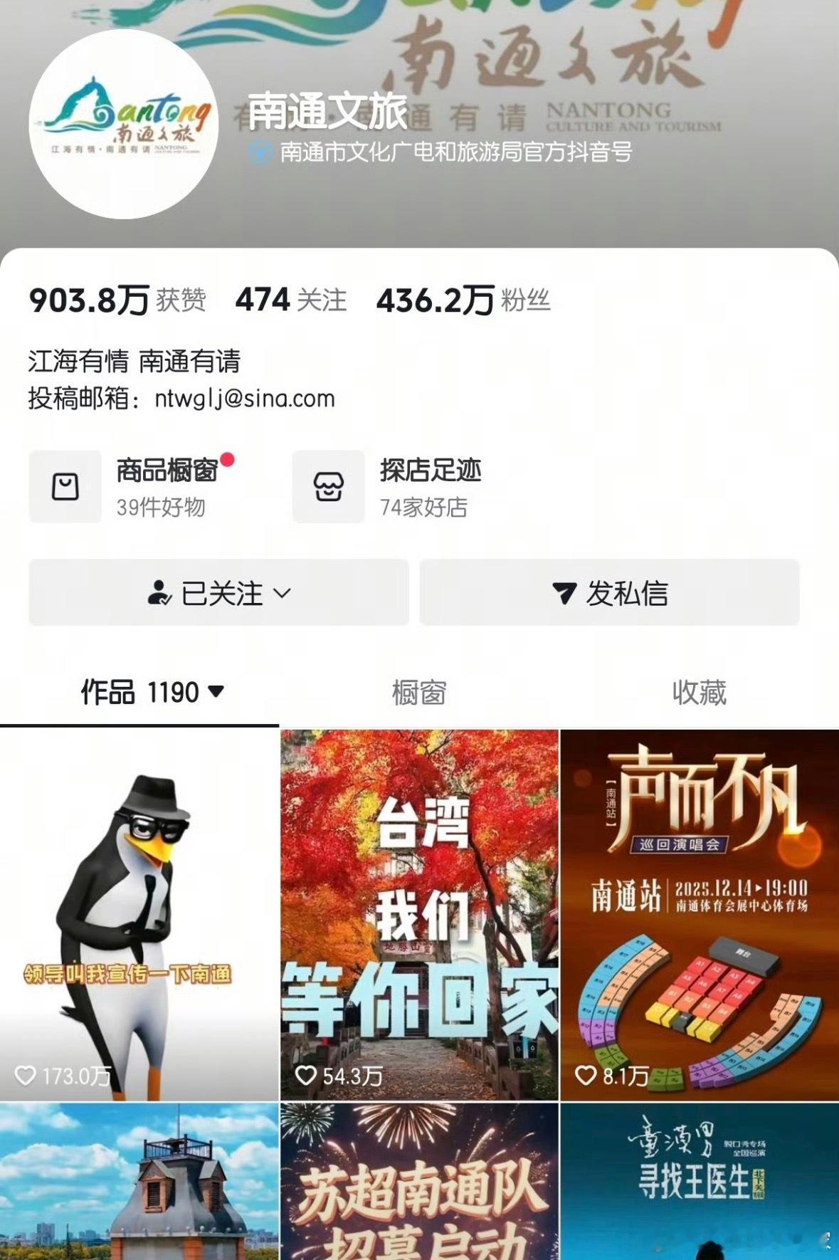 昨天看到的时候都惊呆了,以为是假号,点进去一看还真是文旅官方号,南通文旅这么勇吗