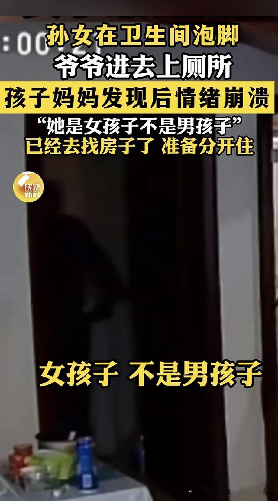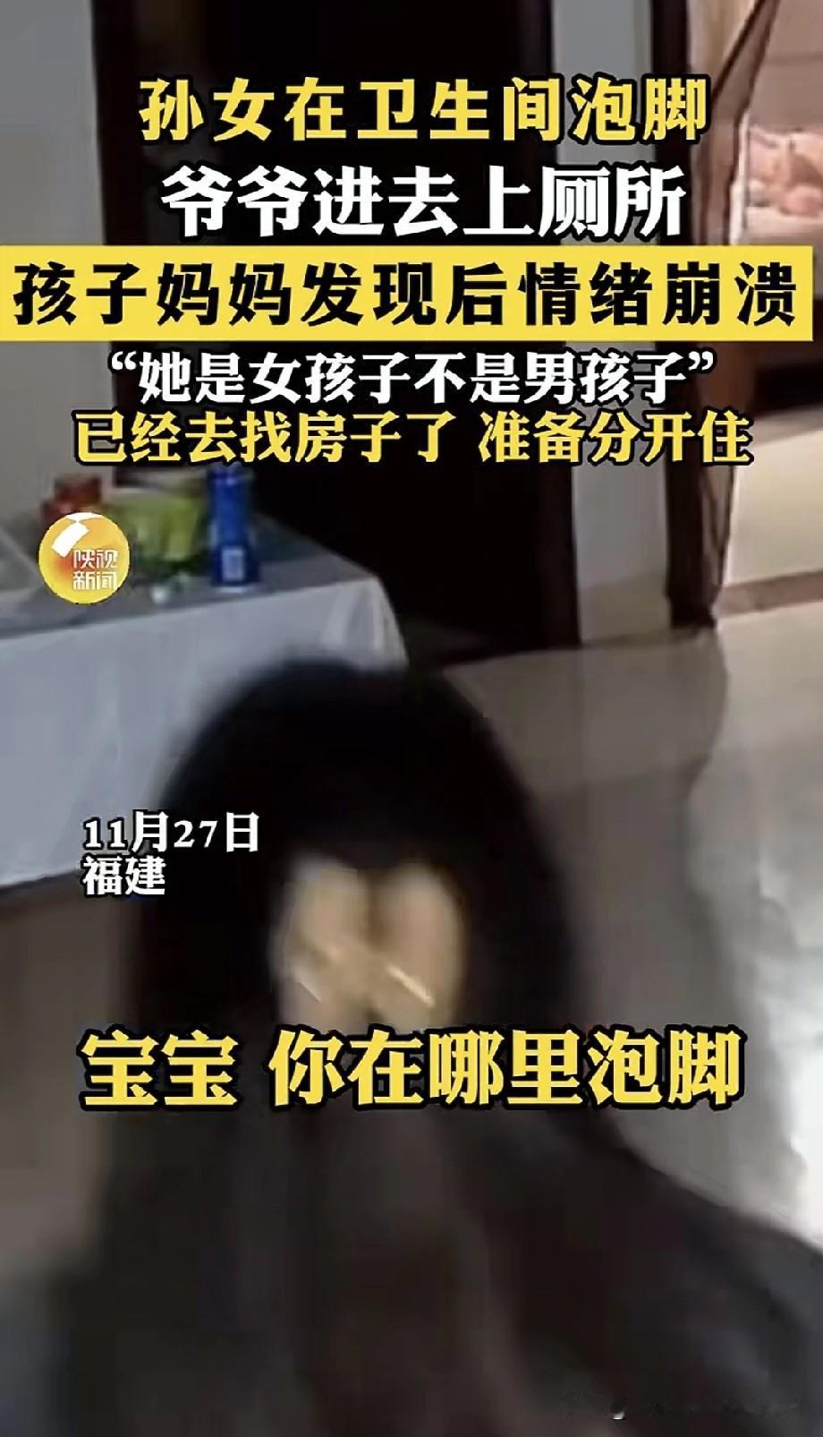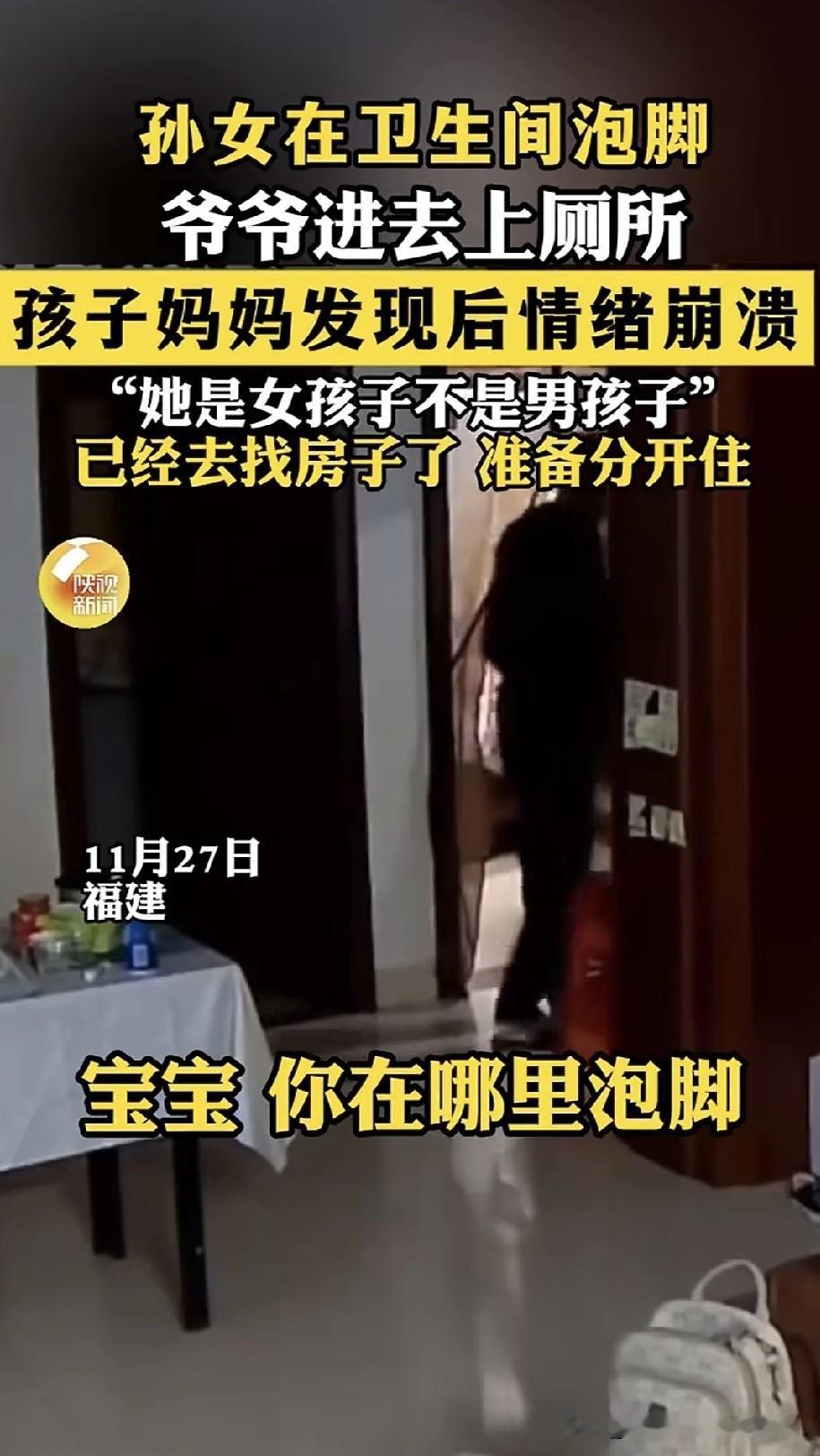 孙女在卫生间长时间泡脚,爷爷进去上厕所,这事儿惹恼了儿媳妇。这其实是做父母考虑欠妥。家里人多,泡脚完全可以在客厅或者房间进行,何必一直占着卫生间呢。 老年人大多有尿急尿频的毛病,根本憋不住。要是非得跟老人计较,那只能让年轻人和老人分开住,别无他法。在居民楼里,在卫生间洗脚一待就是几十分钟,这习惯实在不好,真可谓占着茅坑不拉屎。老人想上厕所憋不住,难道要尿在客厅吗?不过,如果家里有两个卫生间,爷爷还非得进去,那就是爷爷不对了。 像这种矫情的女人,日子肯定不好过。不就是泡个脚嘛,多大点事儿,她却把问题无限放大挂在网上,非要把公公赶出家门,不然就自己搬走,居心不良。十个儿媳妇里有九个半讨厌公公婆婆,她正好借题发挥,从此和老人分开住,不管不顾,达到自己的目的了。等她老了,别人也会这么对她。这也许就是她设的局,就是为了赶走老爷子或是自己搬出去住,现在目的达成了。