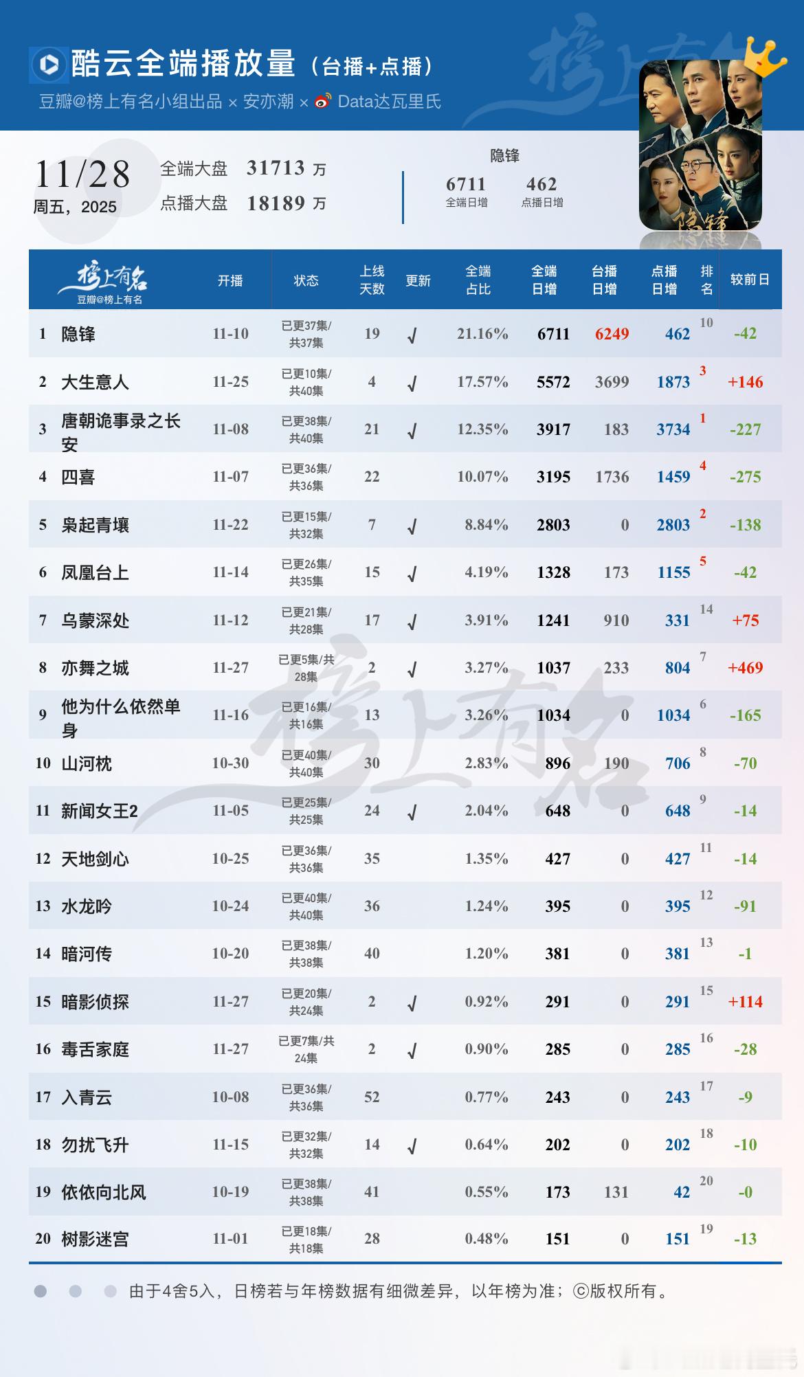 11.28酷云播放量🌴豆瓣榜上有名小组出品隐锋 全端日冠×4大生意人 全端5522,点播1873,涨146唐朝诡事录之长安 3734,降227枭起青壤 2803,降138四喜 点播1459,降275凤凰台上 点播1155,降42亦舞之城 次日点播804暗影侦探 次日点播291迪丽热巴于危局中前行,大生意人数据大生意人数据