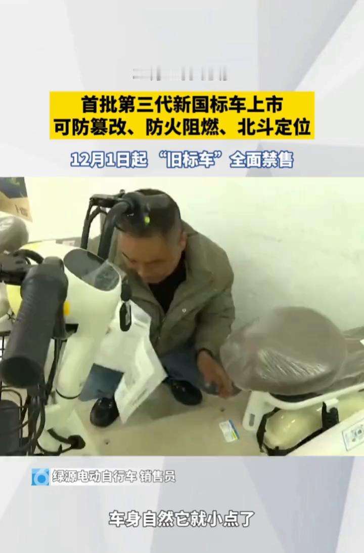 首批第三代新国标车上市,可防篡改、防火阻燃、北斗定位。 雅迪电动自行车销售员。 11月24日昆明,12月1日起"旧标车"全面禁售。现在用料这些要更好,车身用的全部都是防火阻燃材质,这种就是更安全,不容易起火,不容易自燃。还有就是现在的整个车身,整车重量比以前的车子要更重一点,相对来说骑行要更稳更安全,就是速度控制了,车身自然就小点了。售价比以前的车应该要贵个500块钱左右。刚上现在好多人都是在观望态度。