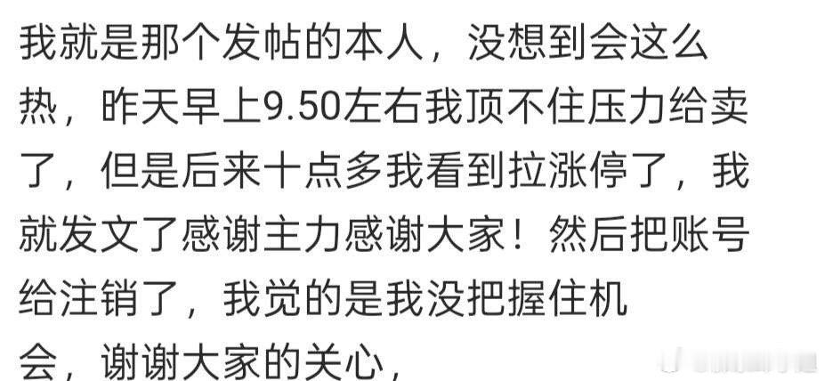 股市也有很多感人的瞬间,某股票因社区大爱,一夜之间热度榜飙升到第一名,有人说这是主力的善意,听到了股民的呼唤,也有人说这个股本身就是主力洗盘,只是巧合……虽然周五主力拉到了涨停,可是对这位父亲却在涨停前给卖了……不论如何如何猜测,我们都要坚信这是一份善意,话说股市无情,人有情,但是我们也要保持冷静的头脑,股市不是我们押注的地方,这里并不存在幻想!看得我眼眶湿湿的,那就给主力一个大大的赞吧!有血性的主力,希望你永远都有涨停板!