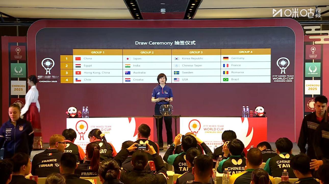 2025成都混合团体世界杯 第一阶段分组第一组:中国🇨🇳、埃及🇪🇬、中国香港🇭🇰、智利🇨🇱第二组:日本🇯🇵、印度🇮🇳、澳大利亚🇦🇺、克罗地亚🇭🇷第三组:韩国🇰🇷、中国台北、瑞典🇸🇪、美国🇺🇸第四组:德国🇩🇪、法国🇫🇷、罗马尼亚🇷🇴、巴西🇧🇷
