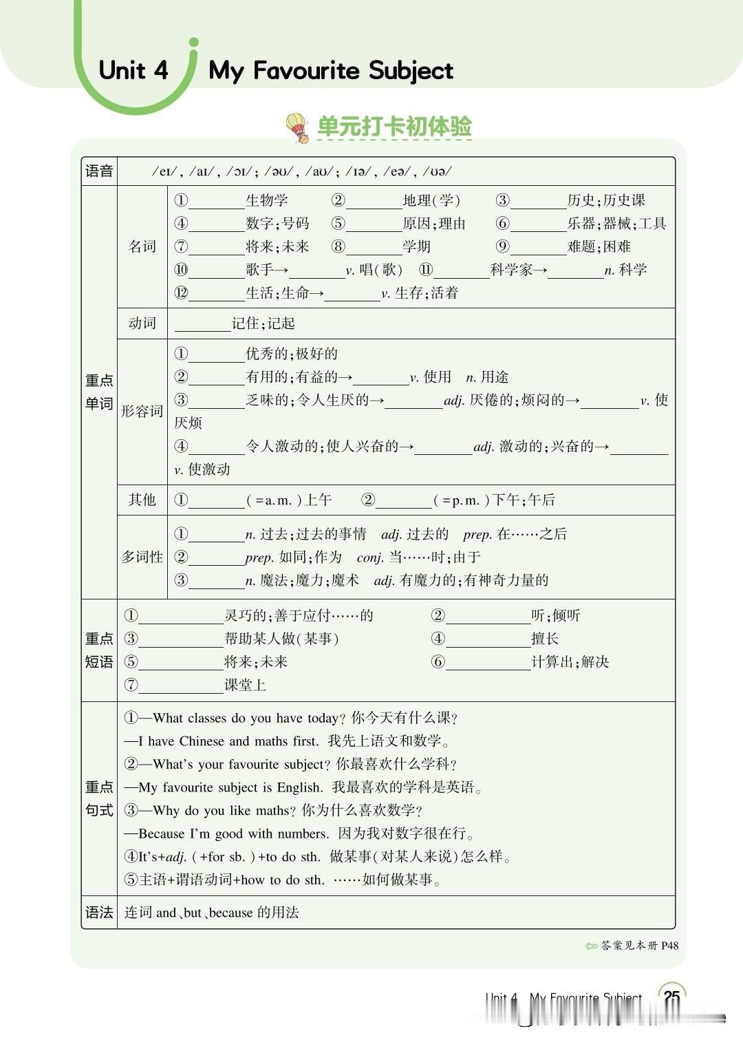RJ)第四单元《My Favourite Subject》 的学习笔记和知识点梳理。本单元围绕“学科”和“喜好”展开。