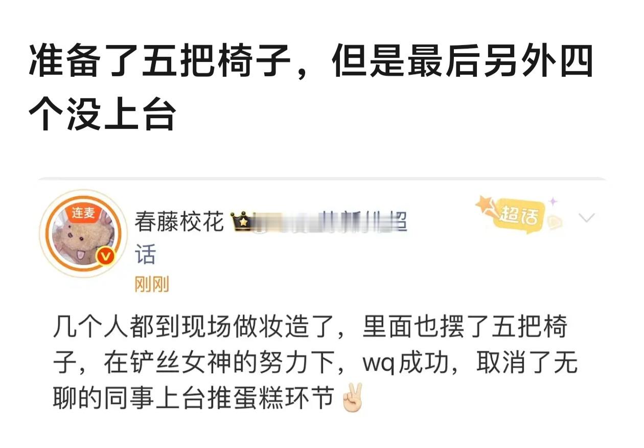 朱志鑫今晚生日会直播没了 准备了五把椅子,但最后另外四个没上台。