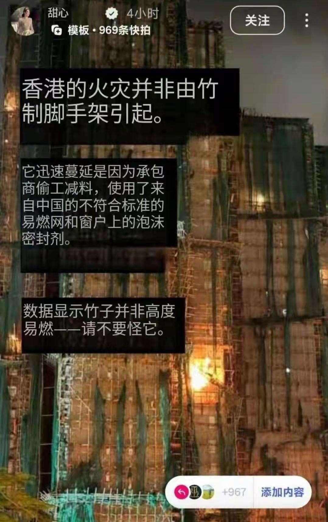 香港大火,竹制脚手架不是问题,都怪内地的不符合标准的易燃物和泡沫密封剂。这是汪诗诗说的。 大埔宏福苑火灾的惨痛悲剧尚未尘埃落定,甄子丹的妻子汪诗诗便在美国社交平台Instagram上迫不及待地发表偏颇言论,将火灾责任甩锅内地,其字里行间透露出的对内地的优越感与偏见令人愤慨。 她在文中直言,香港一直使用的竹制脚手架毫无问题,无需被指责,真正的“罪魁祸首”是来自中国的不符合标准的易燃网和泡沫密封剂。 现在,调查结果根本还没出来,具体怎么回事还不知道,汪诗诗仅凭主观臆断就将矛头指向内地,本质上是戴着偏见滤镜看待内地产品。更令人无法接受的是,她刻意将“内地”称作“中国”,模糊香港作为中国一部分的事实,暴露了其错误的立场认知。 而她后续的操作更被网友不满,她先删除外网争议帖文,然后在内地社交平台微博上道歉,并不在Instagram同步。 汪诗诗这样搞,她本人的名声要坏,连她老公甄子丹的名誉也要受影响。