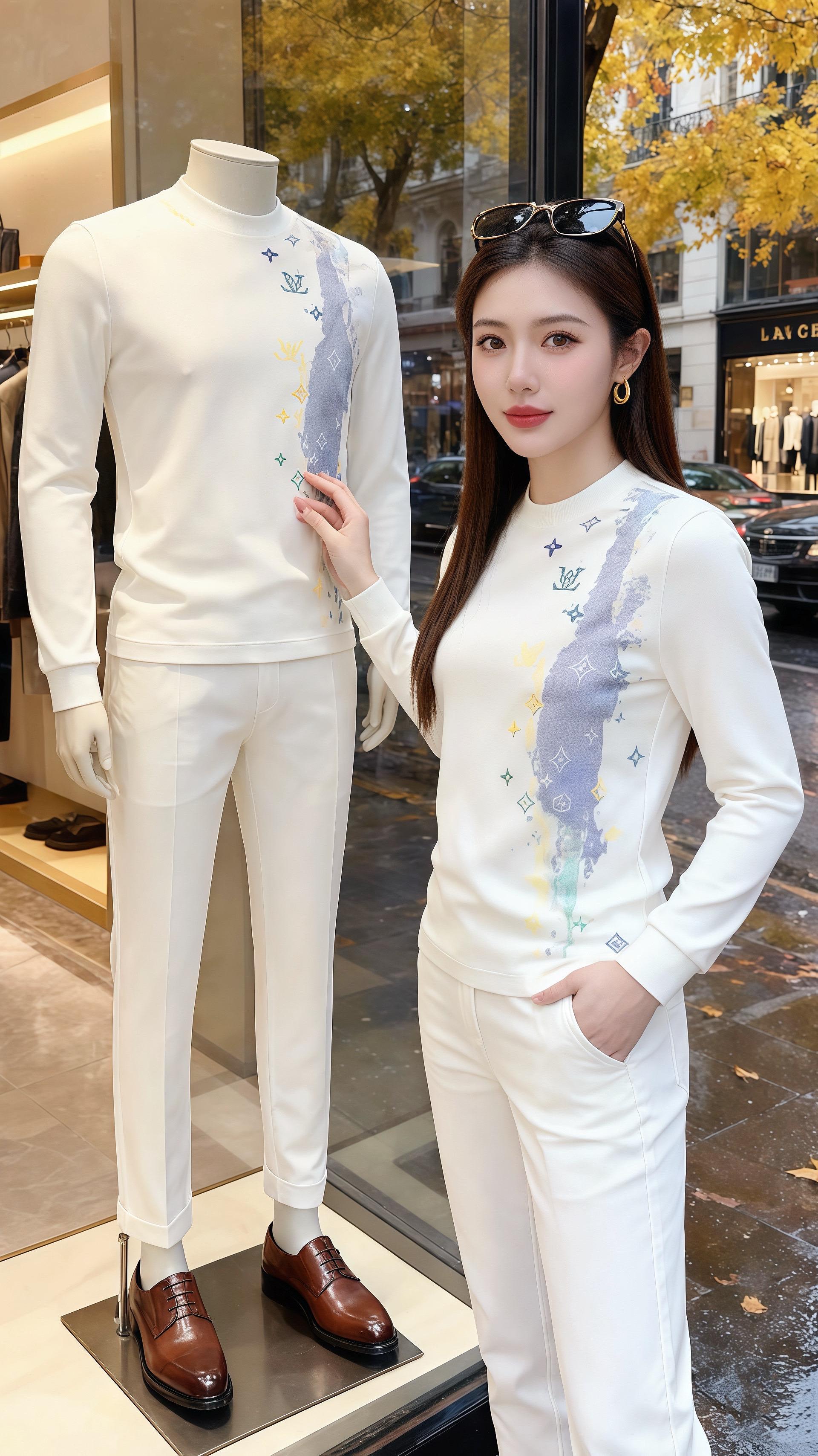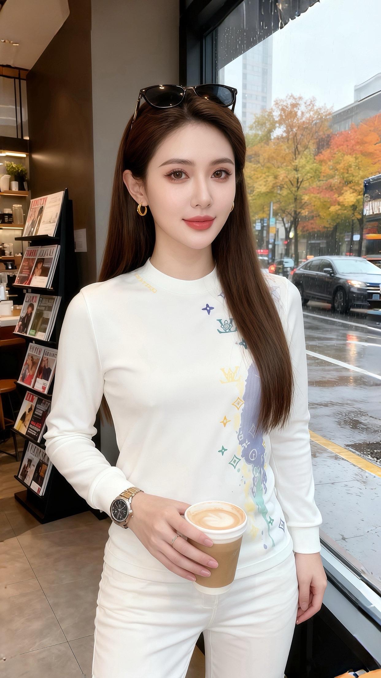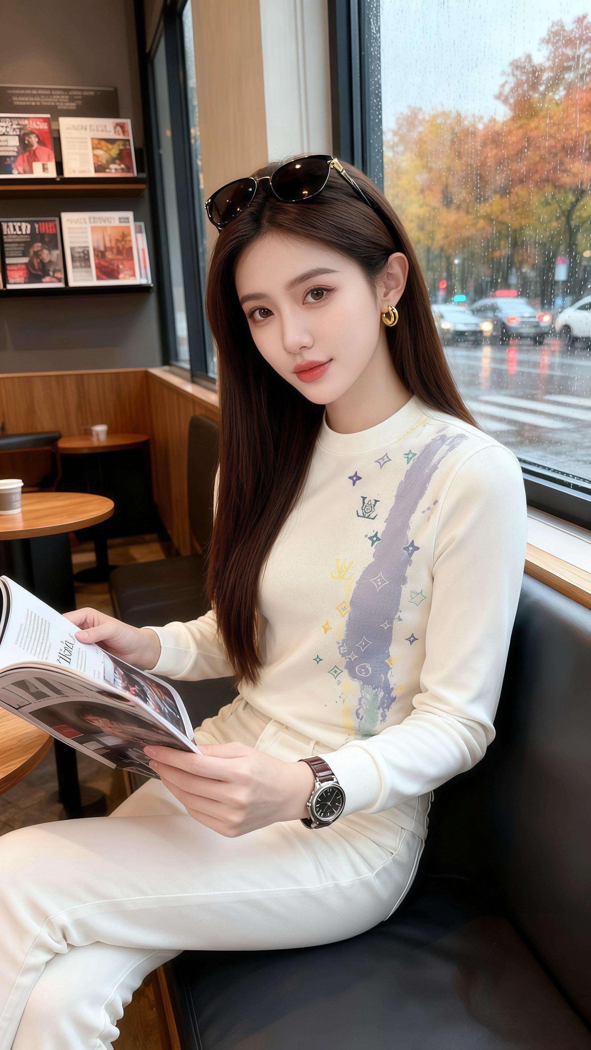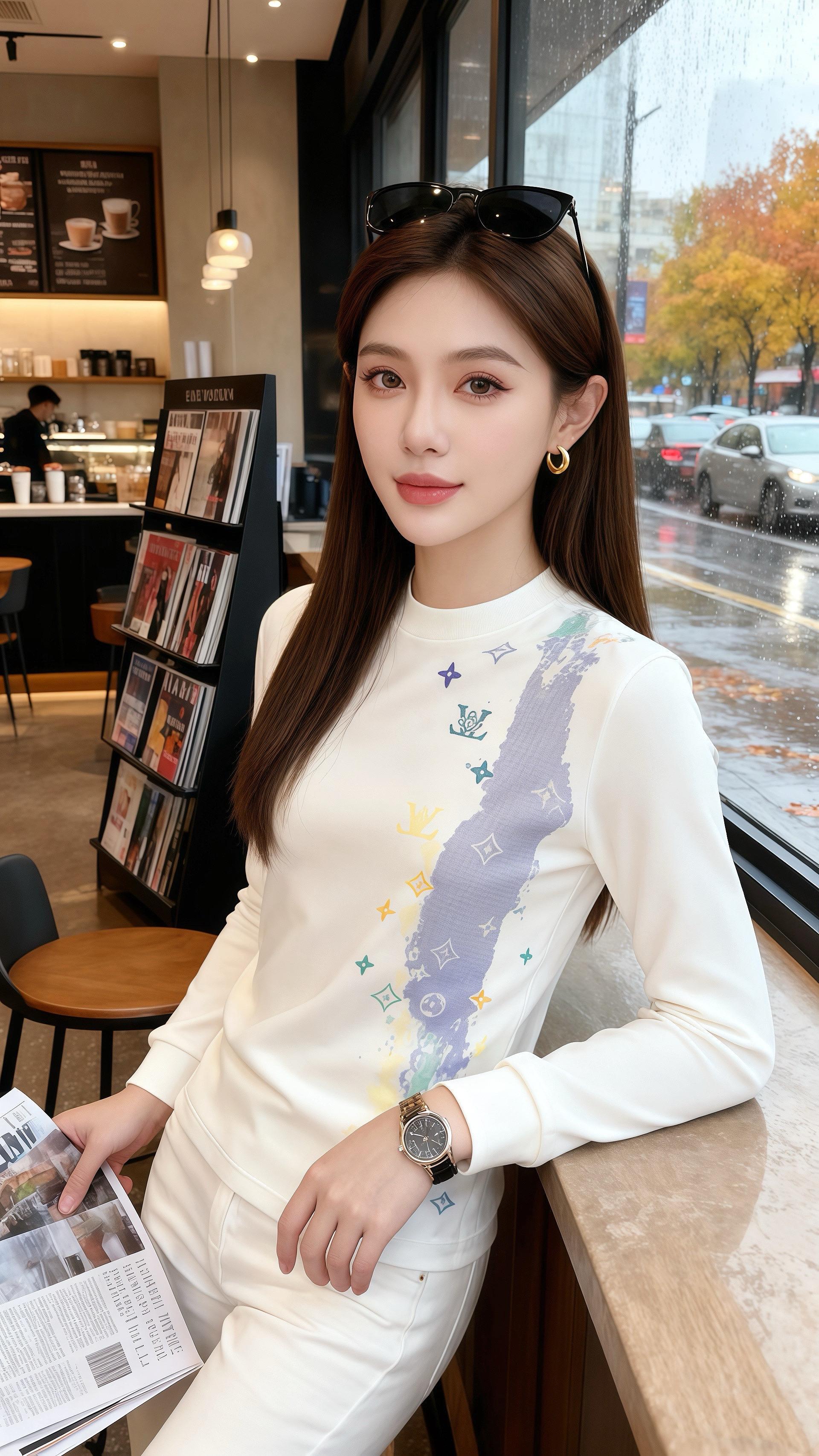 她穿的米白套装衬得肩线很舒展,衣身的彩印像揉碎的冬阳,顺着软滑的面料漫开,既衬得肤色清透,又裹着点漫不经心的温柔。头发掖在耳后,墨镜架在发顶,金色耳饰随抬眸轻晃,和腕间的表链碰出细碎的光。