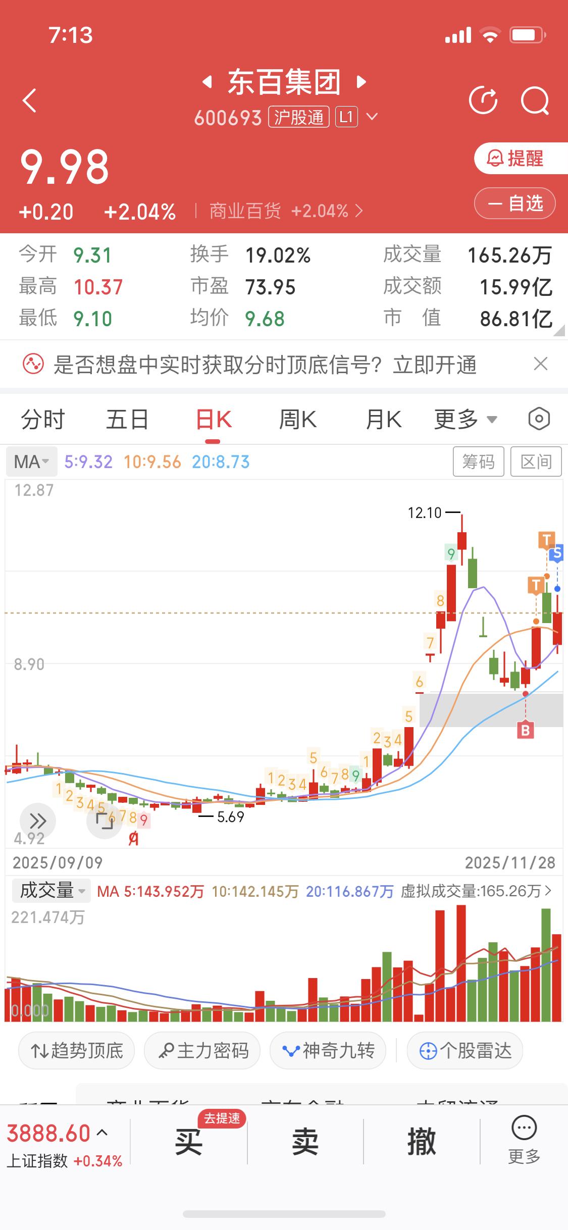 11月30日下周东百集团还真有可能有涨停预期。就看近期市场表现,百货零售板块短线拉升的时候,东百集团可是直接涨停了,中百集团等也跟着封板,国芳集团、广百股份这些都纷纷跟涨。还有零售板块走高的时候,东百集团又是涨停,爱婴室、中百集团等也都有不错表现。从这些联动情况来看,东百集团在板块里的活跃度挺高。要是下周相关板块继续有积极动向,东百集团借着这股势头再涨停也不是没可能,但股市风云变幻,这也只是一种猜测啦。