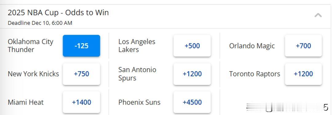 湖人能否再获NBA杯(季中赛冠军) 昨日NBA杯八强出炉,随即给出捧杯赔率,雷霆断层领先高居第一,湖人第二,魔术第三,太阳垫底。具体赔率如下: 1.雷霆(-125)、2.湖人(+500)、3.魔术(+700)、4.尼克斯(+750)、5.马刺和猛龙(同为+1200)、7.热火(+1400)、8.太阳(+4500)。 从赔率看雷霆、湖人、魔术、尼克斯闯入东西部决赛被看好,但一场定胜负的比赛偶然性很大,也许最后棒杯的恰恰是最不被看好的。 竞猜 湖人能否第二次捧起NBA杯?