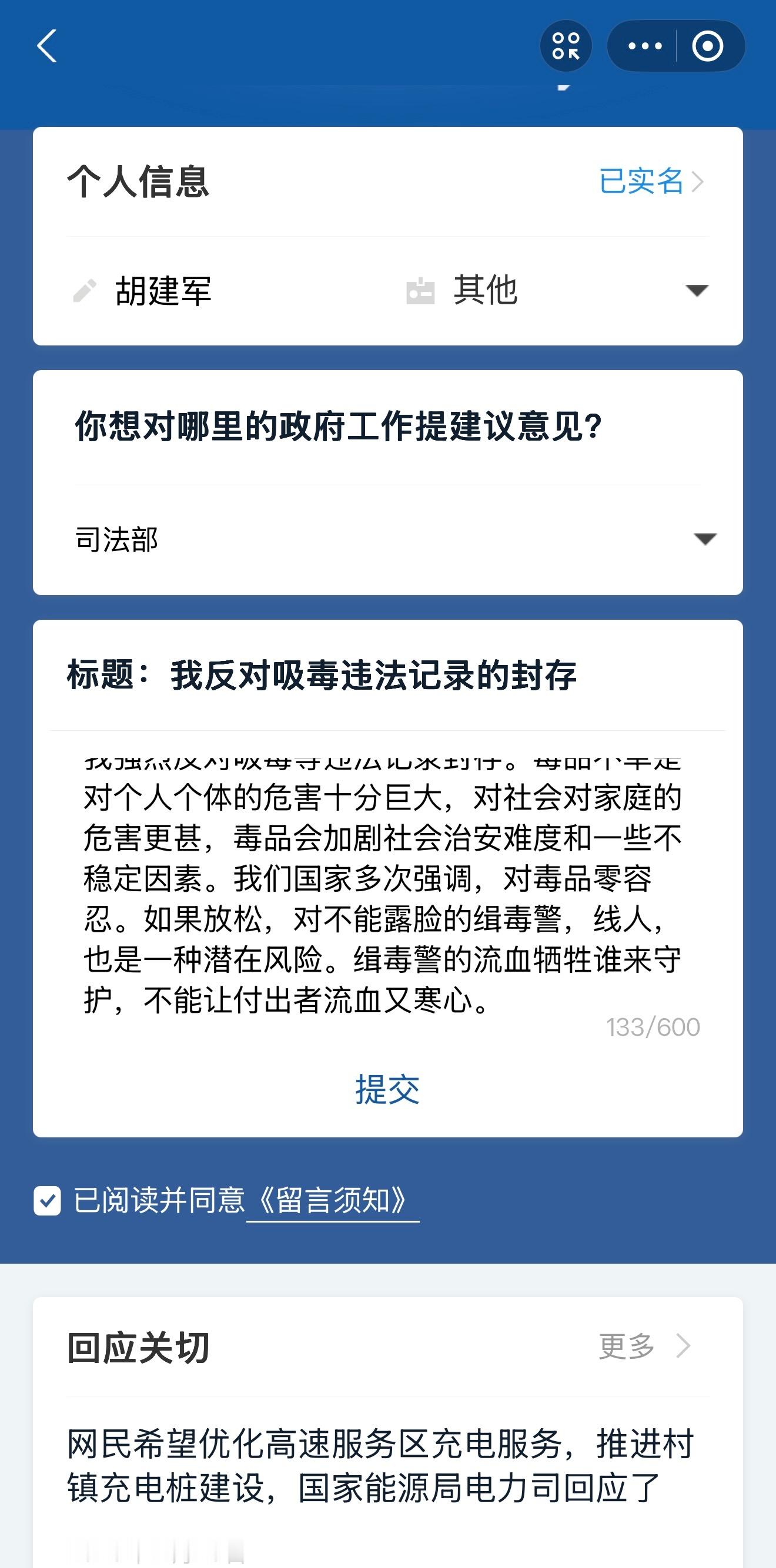 思来想去,一大早就去提交了自己的意见,对毒品零容忍。