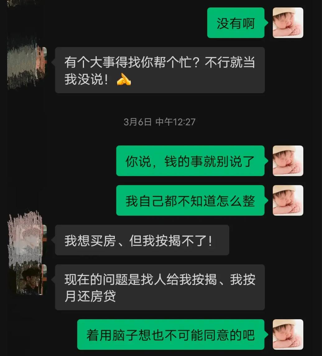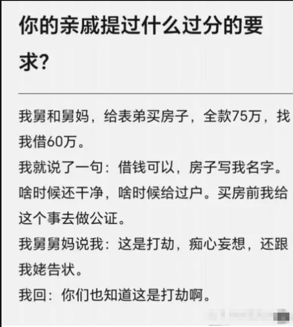 “姨妈,就借您房本用一下!”一年后,她笑着问我妈:房呢? 家人们,谁懂啊?我今儿非得唠唠我表弟这档子事儿,真是把我气得够呛,又哭笑不得! 我表弟,之前捅了个大篓子,网贷欠了一百多个W。家里急疯了,姨妈姨父卖了一套房,亲戚们你三万我五万地凑,我妈也掏了十万给他填窟窿。我当时就跟我妈说:“妈,这钱去向不明,八成是网赌,而且这绝对没完!” 果不其然,才消停一年多,他又来了。这次是三十多万,不敢告诉爹妈,怕二老气倒,转头就求我妈:“大姨,您行行好,把房子先过户给我,我把我公积金那20万取出来还债,完了立马还您!我发誓!” 我妈心软,看着长大的孩子,哭得稀里哗啦,还说还不上就要去寻短见。我拦都拦不住:“妈,赌鬼的嘴,骗人的鬼!这房过户过去,还能不能回来可就难说了!” 你猜怎么着?我妈真去过户了! 一个月后我问起,我妈还乐呵呵:“你弟说了,现在过户回来税太高,等满两年再说,会省不少钱呢!” 我……只能笑笑不说话了。 金句点评: 赌瘾就像无底洞,亲情填不满,房子更填不满。心软是病,得治! 家庭教育 网贷陷阱 远离赌博 亲戚借钱