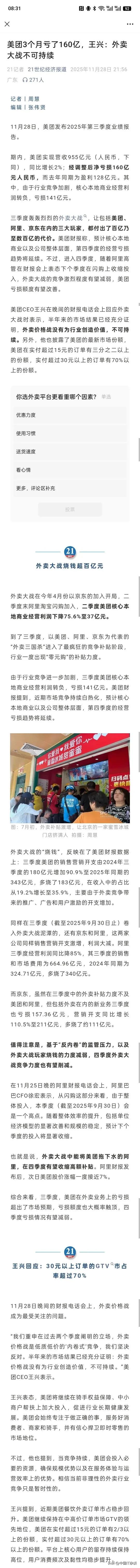 美团3个月亏了160亿!王兴表示外卖大战不可持续。淘宝闪购你答应吗?