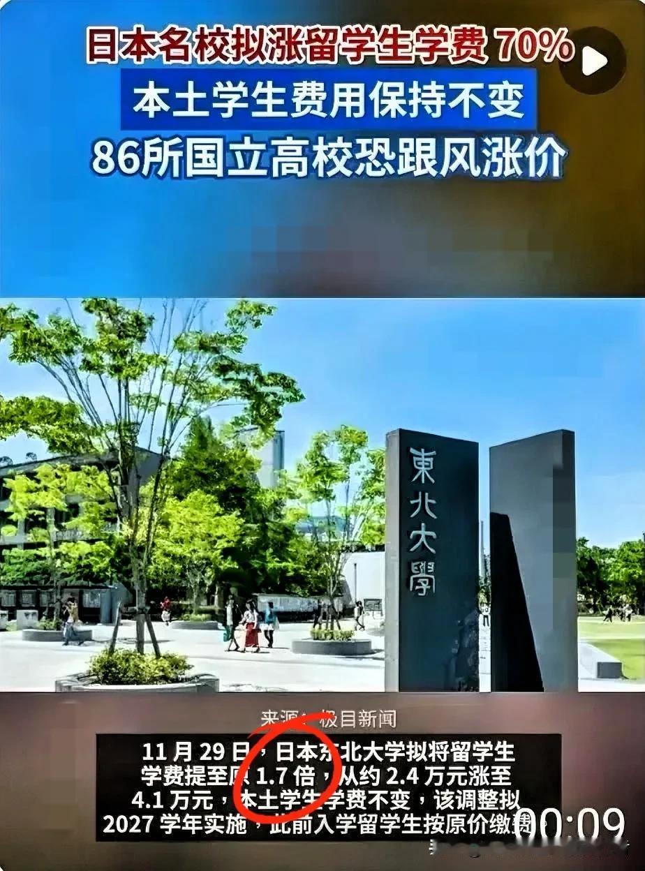 不知道你们有没有注意到, 在最近几日, 日本一所名校,准备给留学生涨学费了,涨幅高达70%。 本土学生的学费不变,而留学生的学费一年要多交1.7万元。 这所学校,原本是比较出名的,在国内也有不少学生去留学,看到这条新闻,不少人说,这就是排外,国籍不一样,学费就不一样。 没想到,日本还搞国籍划分的学费,真是大开眼界。 要知道,很多家庭,在中日两国关系比较友好的时候,就已经准备好,让孩子去日本留学了。 现在中日关系比较紧张,日本本土也有反华情绪,万一遇到什么事情,孩子的安全谁来保证呢? 当然了,对于经济条件好的家庭来说,这点涨幅根本不算什么,可能家长反感的更多,是这条政策,而不是多交钱了。 留学生学费的大幅上涨,无疑反映了日本社会对外来学生的态度变化。这样的政策不仅会影响未来留学生的选择,还可能导致日本高等教育国际化进程的放缓。 值得注意的是,这种差异化收费的政策可能会导致优秀人才流失。如果日本继续维持这种排外态度,将可能影响其在全球教育市场的竞争力。 希望日本能够重新审视其教育政策,为未来的国际合作与交流创造更为友好的环境。 大家怎么看这件事呢?